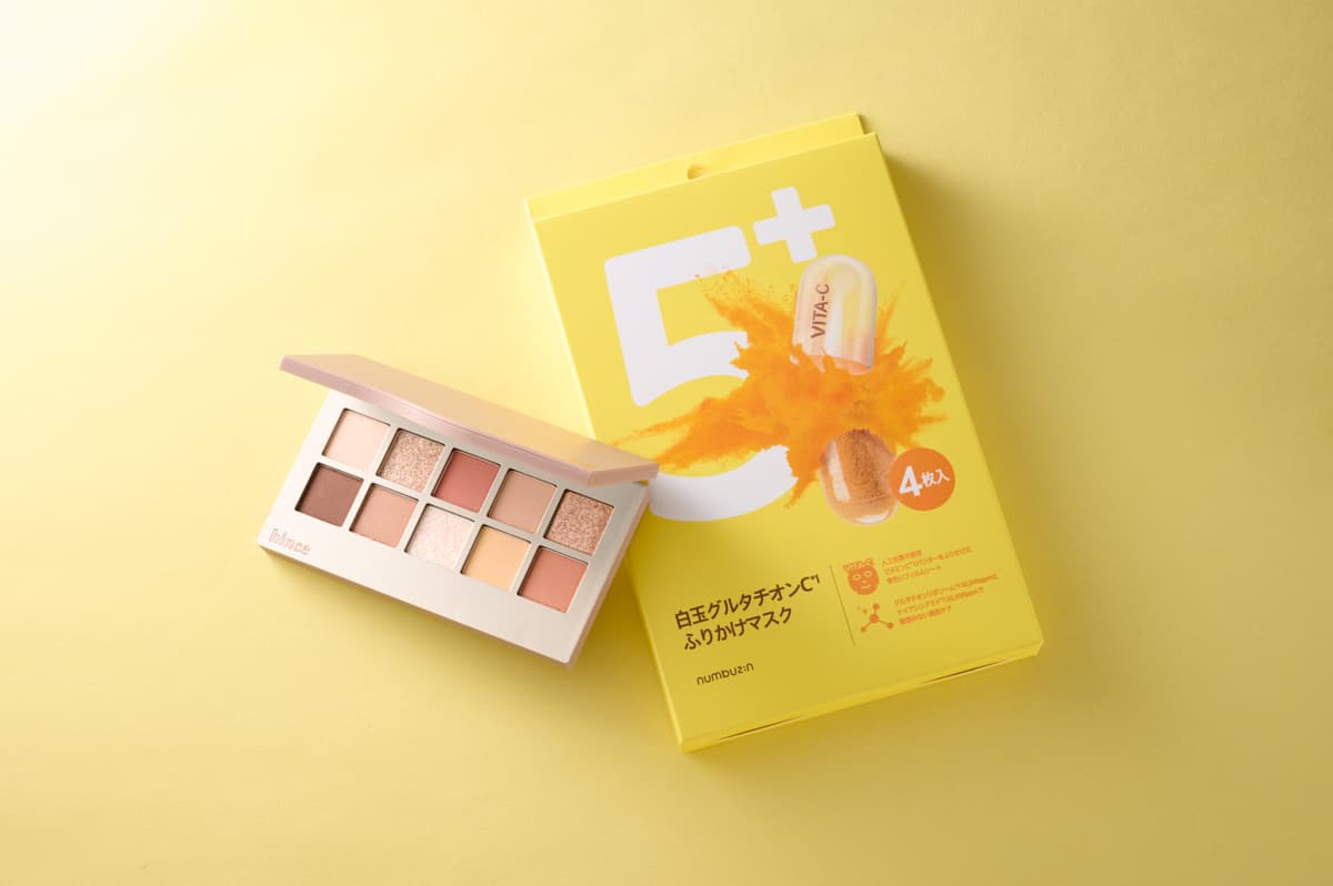 <写真右>ビタミンCをふりかけた黄色いシートに高濃縮グルタチオンC美容液をたっぷり入れ込んだ、くすみケアマスク。疲れでくすんだ肌も吹き飛ぶのでリピートしています。