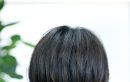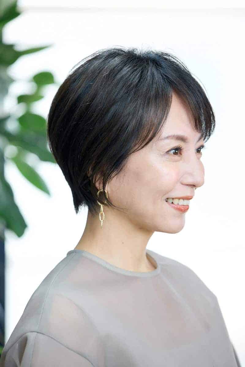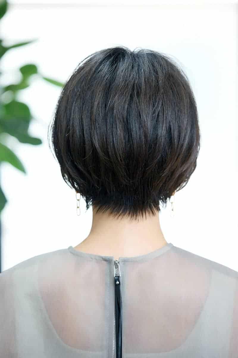 【HAIR DATA】多毛な髪質なので全体的にすいて整え、後頭部はレイヤーを入れ丸みが出やすいように調整をしました。前から見た時は短めボブのようなイメージですが、もたつきやすい襟足部分はスッキリと。サイドからバックまで美しいシルエットにしてメリハリをつけました。前髪はバランスをとりながら長めに残し、大人っぽく上品な印象に仕上げています。白髪をケアしたブリーチを入れていたことで、パサつきが目立ってしまっていたので、髪がきれいに見える若見えつやブラックにチェンジ。くびれがあるシルエットにすることでメリハリを出し、顔まわりも華やかなスタイルへ。