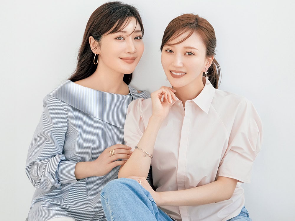 <NADEAさん>パンツ¥3,990(ユニクロ アンド ジェイ ダブリュー アンダーソン/ユニクロ)イヤリング¥3,080〈ハクフルール〉リング¥13,200〈c/n〉(ともにロードス)シャツ/スタイリスト私物 <瀬戸さん>ブラウス¥35,200(アナイ)パンツ¥12,980(インディヴィ)ピアス¥110,000〈ウノアエレ〉リング¥9,900〈ワンエーアールバイウノアエレ〉(ともにウノアエレ ジャパン)