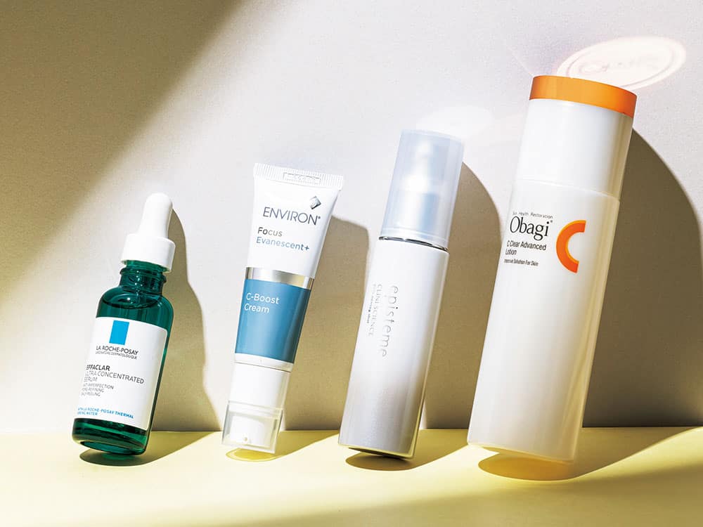 (左から)エファクラ ピールケア セラム 30㎖ ¥5,280/ラ ロッシュ ポゼ、C−ブーストクリーム 25㎖ ¥6,930/エンビロン、エピステーム ポアニューイングショット 50㎖ ¥8,800、オバジC クリアアドバンスドローション 150㎖ ¥4,950/ともにロート製薬
