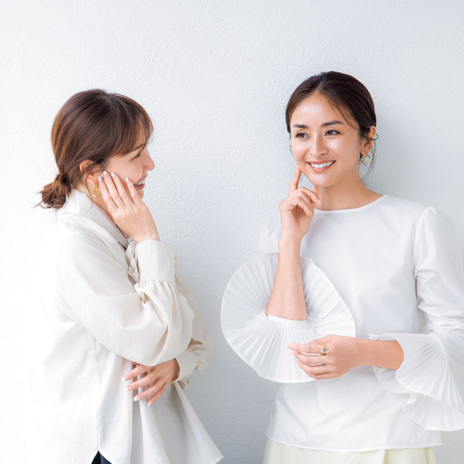 1カット目:【ウェブさん】ブラウス[つけ衿付き]¥9,900(セルフィスト/アバハウスインターナショナル オンラインストア)リング¥22,000(アグ)【尾﨑】ブラウス¥9,350(エマ・ルージュ・ヴィフ/アバハウスインターナショナル オンラインストア)
