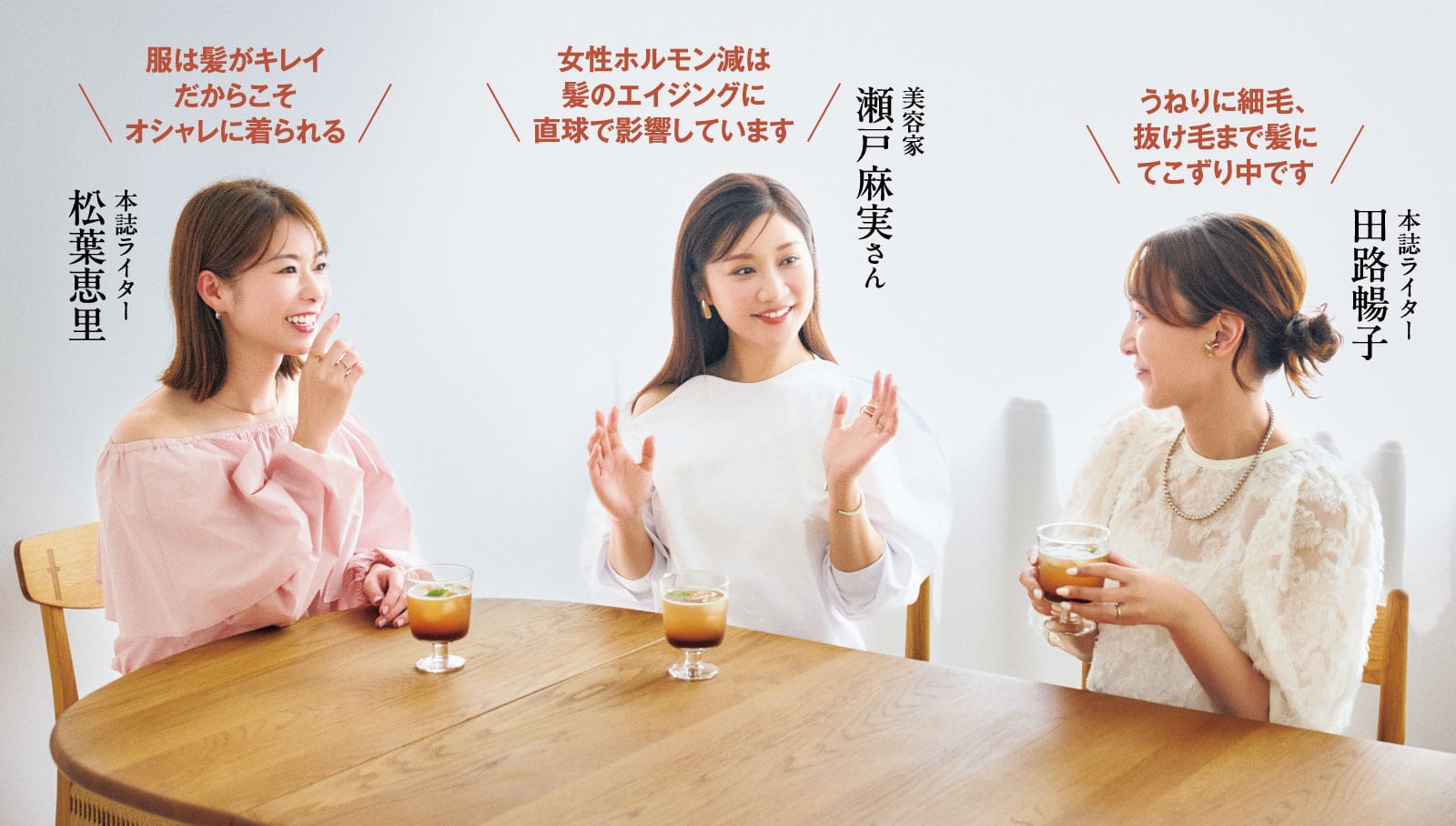 白髪や薄毛、うねりにパサつき……、STORY世代で髪悩みを持たない人はきっといないでしょう。その悩みは女性ホルモンの減少が大きな要因かも? 揺らぎ期を迎えた今、直面する髪悩みについて、美容家・瀬戸麻実さんと日頃、美容企画に関わるSTORYライターが語らいました。