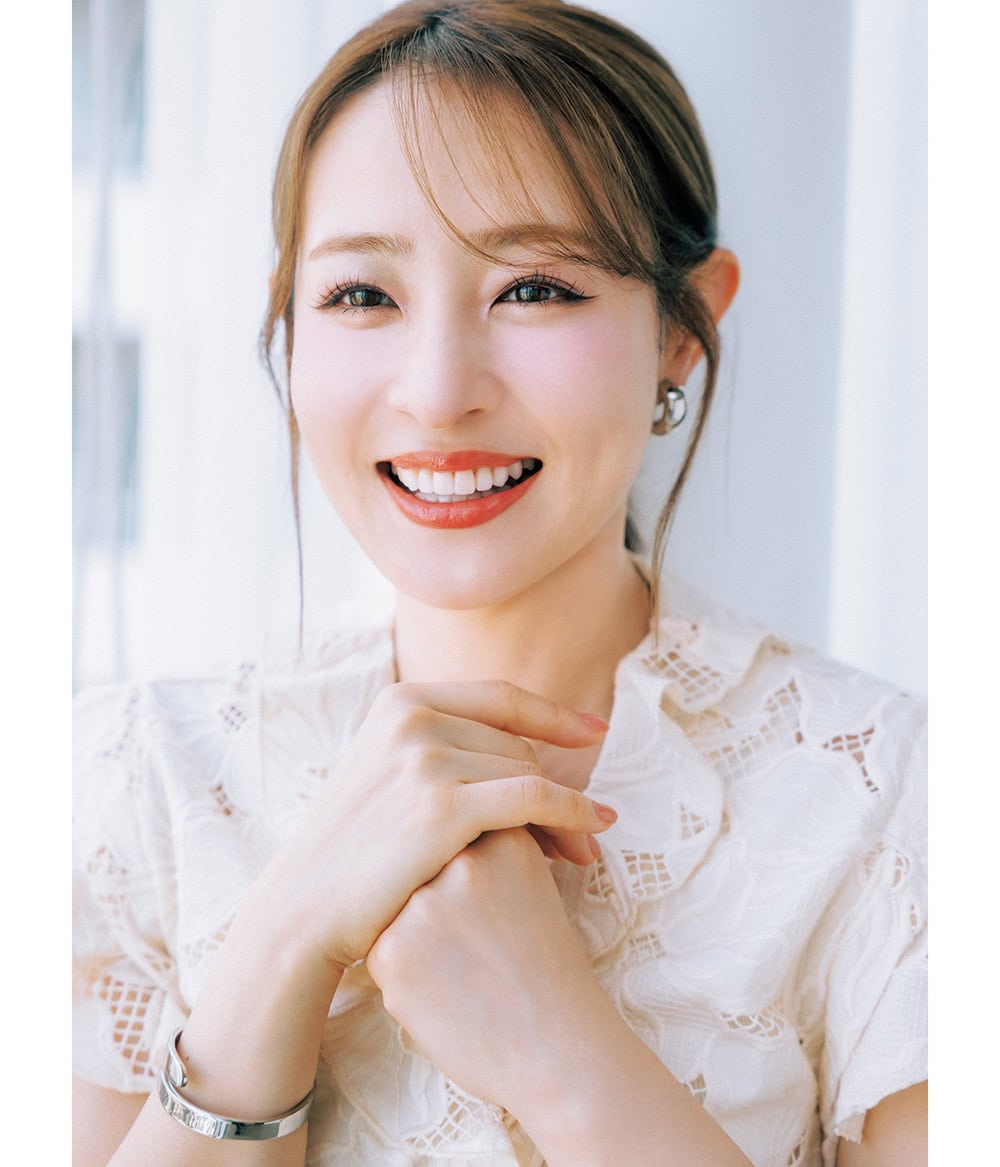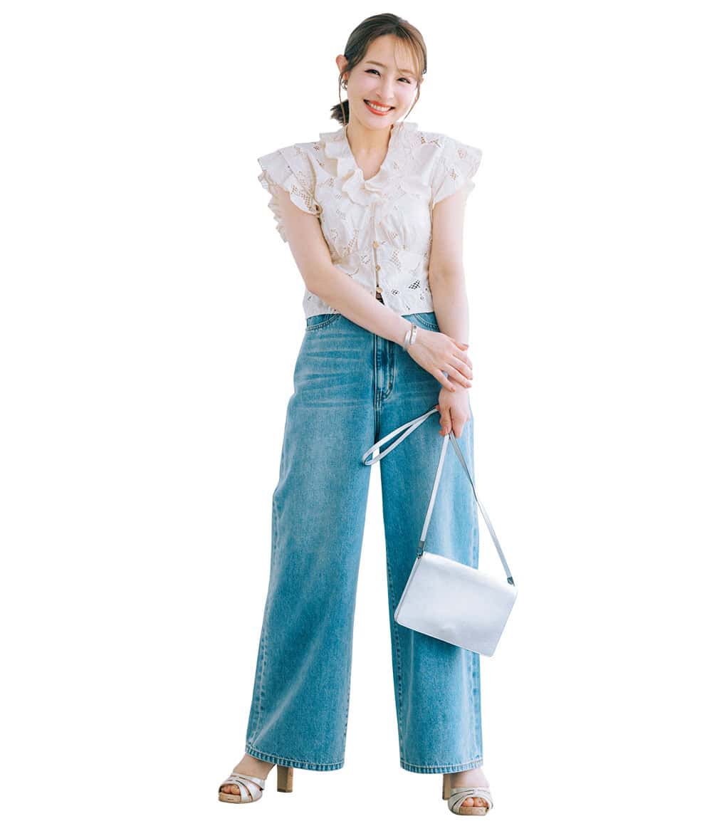 <profile写真>グレートップス¥19,800(アニュアンス) サテンパンツ¥19,800(アルページュストーリー プレスルーム) サンダル¥15,950(ダイアナ/ダイアナ 銀座本店) イヤリング¥7,700〈ムー〉 ネックレス¥3,080〈デイジールイス〉 ブレスレット¥7,300〈ヴィオラ〉(すべてロードス ショールーム) 白カットソー/スタイリスト私物<メーク>デニムパンツ¥24,200(カデュネ プレスルーム) サンダル¥21,890(ダイアナ/ダイアナ 銀座本店) バングル¥7,150〈イエルズ〉 イヤリング¥2,420〈シースキー〉(ロードス ショールーム) レーストップス/大沢さん私物