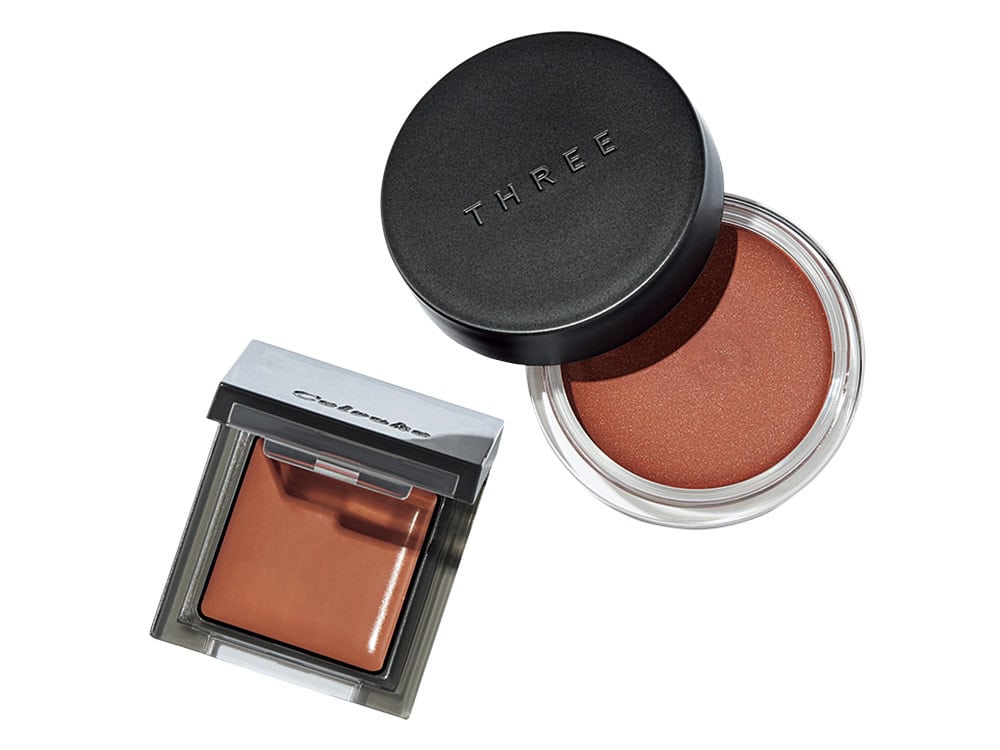 〈右〉偏光パールのブラウン。グラムトーンカラーカスタード 05 ¥3,300(THREE)〈左〉クリーミーなテラコッタ。インフィニトリー カラー N 06 ¥3,520(セルヴォーク)