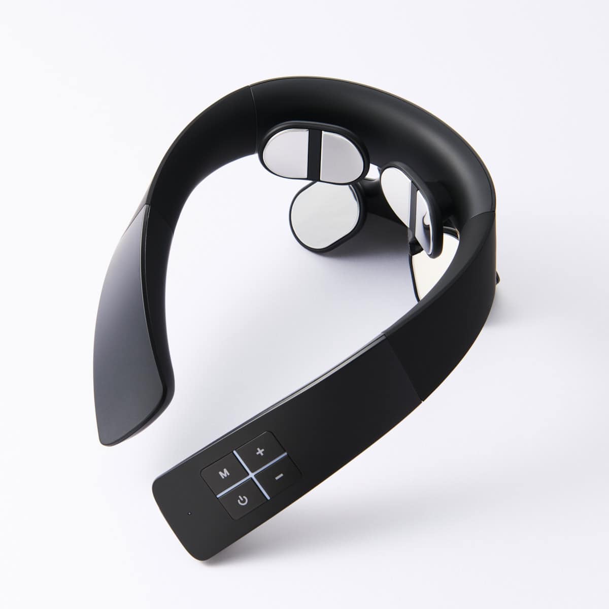 首元のエイジングケアは、お手入れ以前に、まず首の凝りを取ることが大切。こうした首のリラクゼーションを目的とした機器は少なくないけれど、単に首をぐるりと囲むだけでなく首の下のほうに伸びた特別なパットを含めて、6枚ものパットが肩や背骨の方まで幅広くリラックスさせてくれる設計。EMSのちょっとピリピリとする感覚が疲れている時ほど心地よく、筋肉をほどよく鍛えてくれるのでまさに顎周りの緩みを防いでくれるエイジングケアともなるはず。