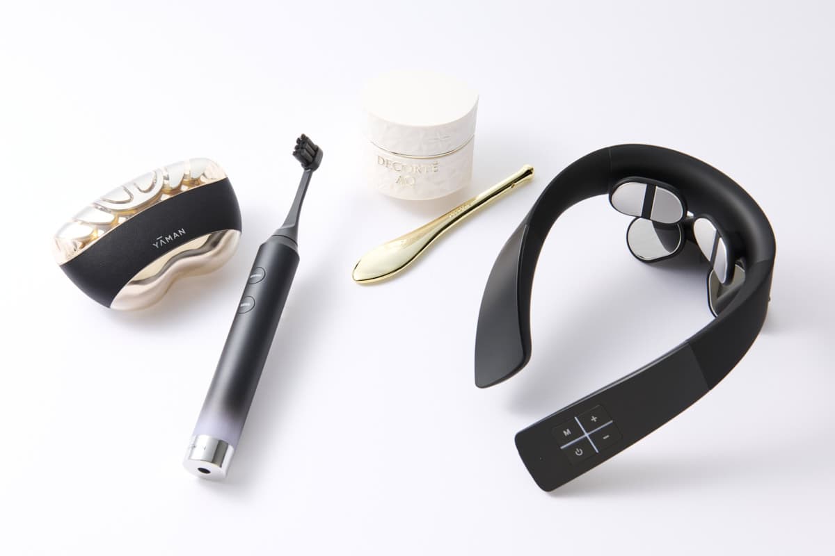 もちろん美容機器も効果的。首の凝りを取りながらの首のエクササイズや、先ほどご紹介した親指マッサージをさらに効果的に行うカッサ機器など、首に使える美容機器も豊富。自分が1番心地良いと思うものを選んでコンスタントに続けて欲しい、それが首元エクササイズ1番のコツ。