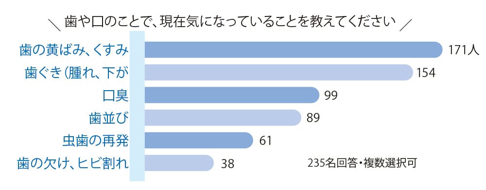 読者のリアルな悩みがアンケートで判明。実際、40代になると象牙質の厚みが増し黄ばみが進行、嚙み合わせのストレスで歯が欠けたり、30代までの銀歯や詰め物の劣化も目立つように。歯科検診を後回しにしたツケで、40代に突入してから慌てる人が急増。