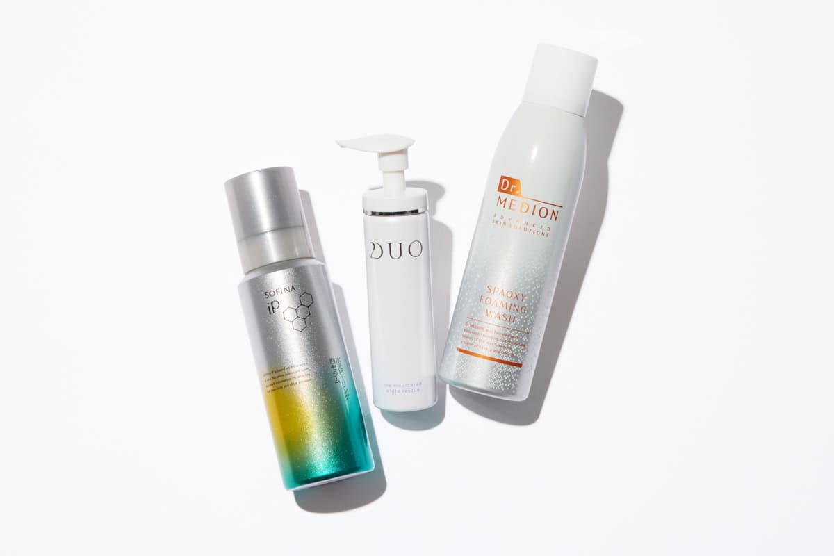 (左)肌になじませた炭酸泡を拭き取ることで不要な角質を取り除き、うるおって透明感のある肌へ。ソフィーナiP 水光ピーリング泡セラム 120g ¥4,290(編集部調べ)/花王 (中)3種の薬用成分と9000+PPMの高濃度の炭酸泡が肌にシュワっと素早くなじむ導入美白美容液。デュオ ザ 薬用ホワイトレスキュー 40g [医薬部外品]¥7,040/プレミアアンチエイジング (右)炭酸ガスを高濃度に含んだ濃密泡で、毛穴の汚れをオフしながら巡りをアップ。ドクターメディオン スパオキシフォーミングウォッシュ 150g ¥2,970/メディオンリサーチ・ラボラトリーズ