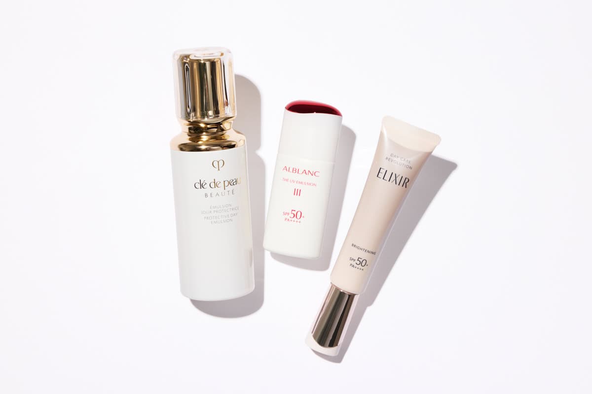(左)肌のうるおいバリアを整えて、日中の紫外線や乾燥などの環境ダメージから守る。クレ・ド・ポー ボーテ エマルションプロテクトゥリス 125ml SPF25/PA+++ ¥15,400/クレ・ド・ポー ボーテ (中)化粧水の後に使用することで、うるおいながら肌を紫外線から守る朝用UV乳液。アルブラン ザ UVエマルジョン III SPF50+/PA++++[医薬部外品]30ml ¥6,050(10/11発売予定)/花王 (右)乳液・下地・プロテクターの効果が1本に集結。スキンケア成分の高配合と高いUV防御力の両立で、ハリツヤ肌に。エリクシール デーケアレボリューション ブライトニング + ba [医薬部外品]35ml SPF50+/PA++++ ¥3,740(編集部調べ)/エリクシール