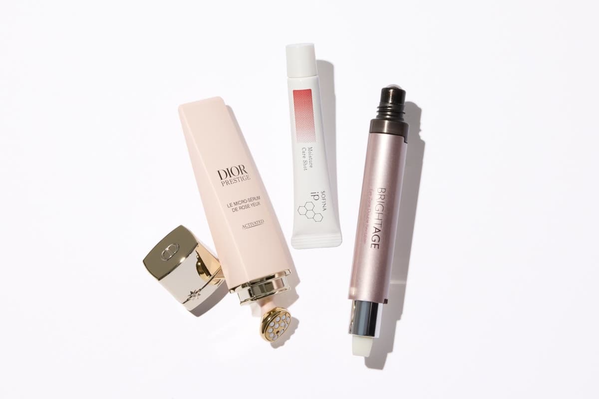 (右)疲れた印象を速攻回復。コラーゲン結合に関わる、グランヴィル ローズ由来の銅を豊富に配合しうるおってハリのある目元に。ディオール プレステージ マイクロ セラム ユー 20ml ¥30,800/パルファン・クリスチャン・ディオール (中)目元や口元などの乾燥が気になる部分にピタッと密着し、うるおいをキープ。乾燥による小ジワも目立ちにくくする。ソフィーナiP うるおい高密着ショット 10g ¥1,980(編集部調べ)/花王 (左)セラムとバームの2 in 1スティックで、乾燥を感じる日中の目元にハリとツヤを。ブライトエイジ アイゾーン ダブルリバイタライザー 目もと用美容液 4.5mL目もと用美容オイルバーム 3g ¥7,150/第一三共ヘルスケアダイレクト