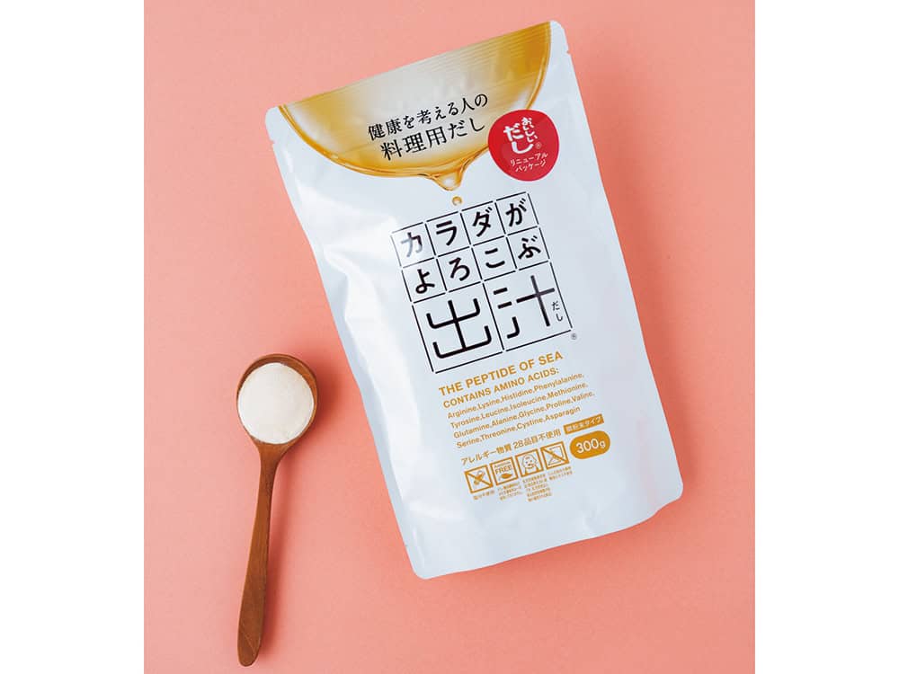 だしに含まれるアミノ酸には、腸を修復したり、神経を落ち着かせる働きが。超微粒子だから気軽に取り入れられます。カラダがよろこぶ出汁 300g ¥1,944/ビーバン