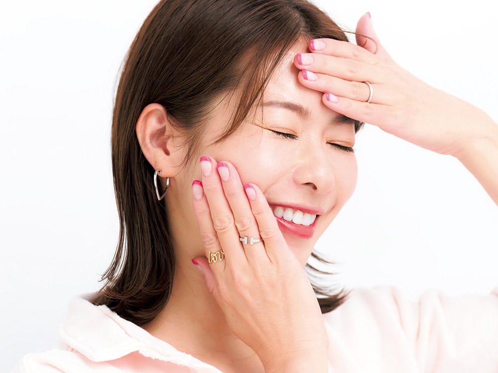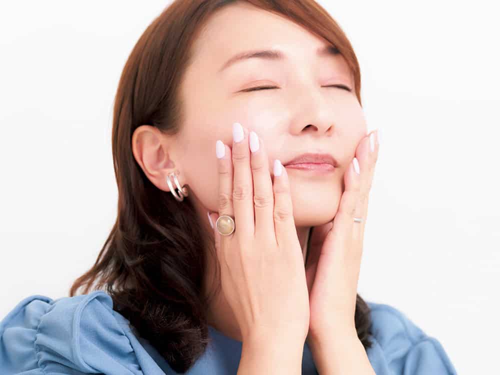 頰を引き上げるように馴染ませてハンドプレスすると肌がピンとします。