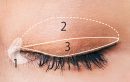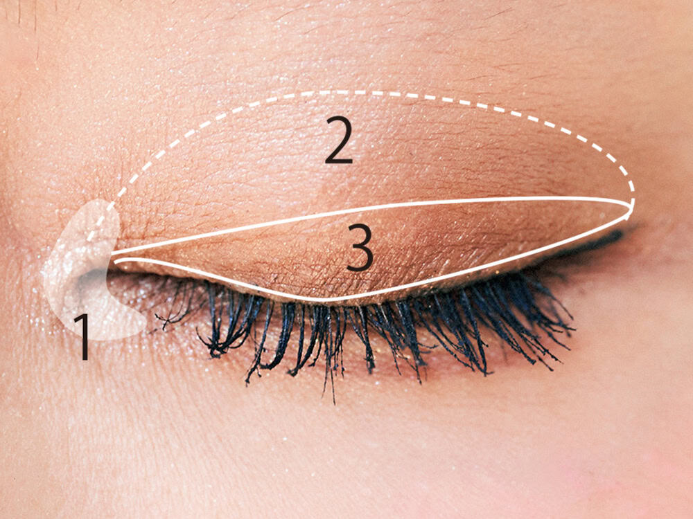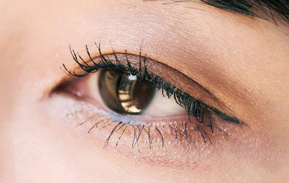 黒より軽やかで透明感が出るのがネイビー。目尻・まつ毛の間を埋めるようにラインを。マスカラは根元しっかりめに、下まつ毛にも。