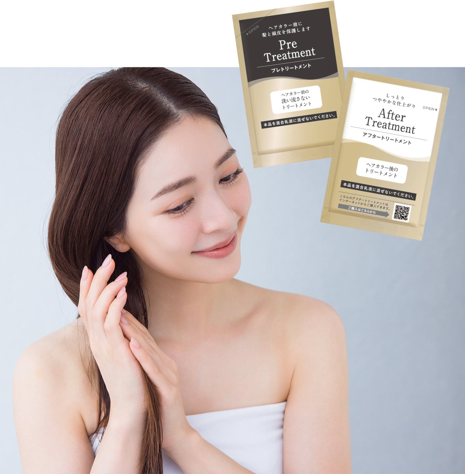 ヘアカラー前には傷んだ髪を補修する洗い流さないプレトリートメントで髪と頭皮を保護し、ヘアカラー後は枝毛や切れ毛を防いでくれるアフタートリートメントのWケア。髪を大切に想いながら、贅沢な気持ちでセルフカラーできるのも嬉しいポイント。ダブルトリートメントで、思わず触れたくなるような髪へ導きます。