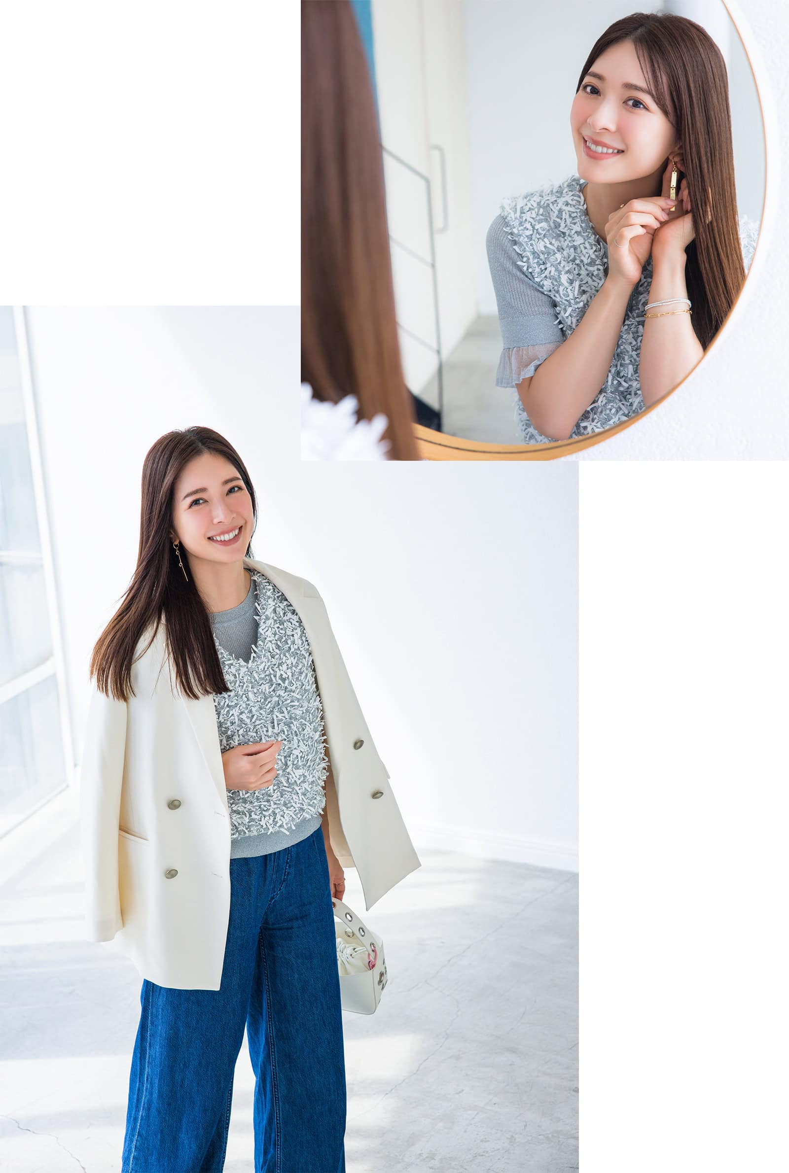 [モデル着用]1カットめ:ニット¥31,900(ソブ/フィルム)ピアス¥50,600(フェルセラ/ZUTTOHOLIC)ブレスレット¥14,300(ワンエーアールバイウノアエレ/ウノアエレ ジャパン)2カットめ:ベアトップ(スタイリスト私物)3・4カットめ:ベスト¥19,800(カデュネ) ニット¥16,500(ウィークエンド)ジャケット¥25,300(マイストラーダ)デニムパンツ ¥9,990(Gap)バッグ¥16,500(ナナナナ)ピアス¥12,100<ワンエーアールバイウノアエレ>YGブレスレット¥162,800<ウノアエレ>(ともにウノアエレ ジャパン)ブレスレット各¥5,720(ともにピルグリム/ZUTTOHOLIC)ハートリング¥160,600ピンキーリング¥52,800(ともにマリハ)