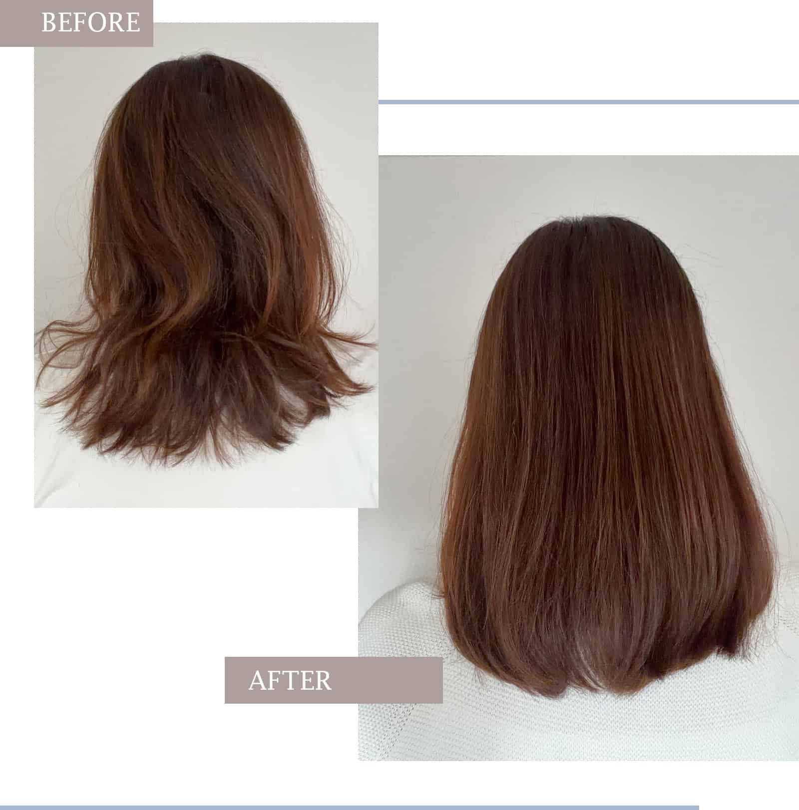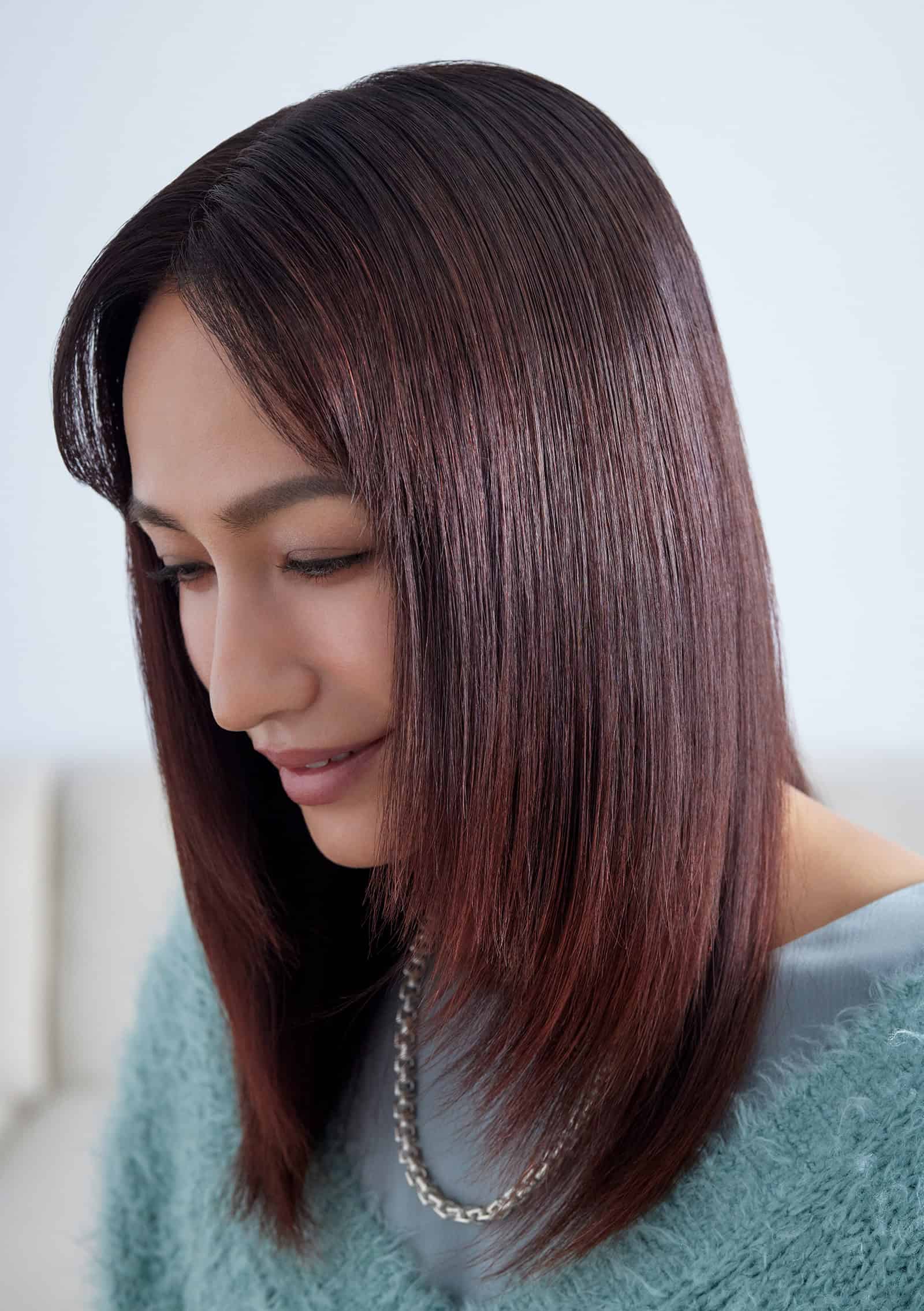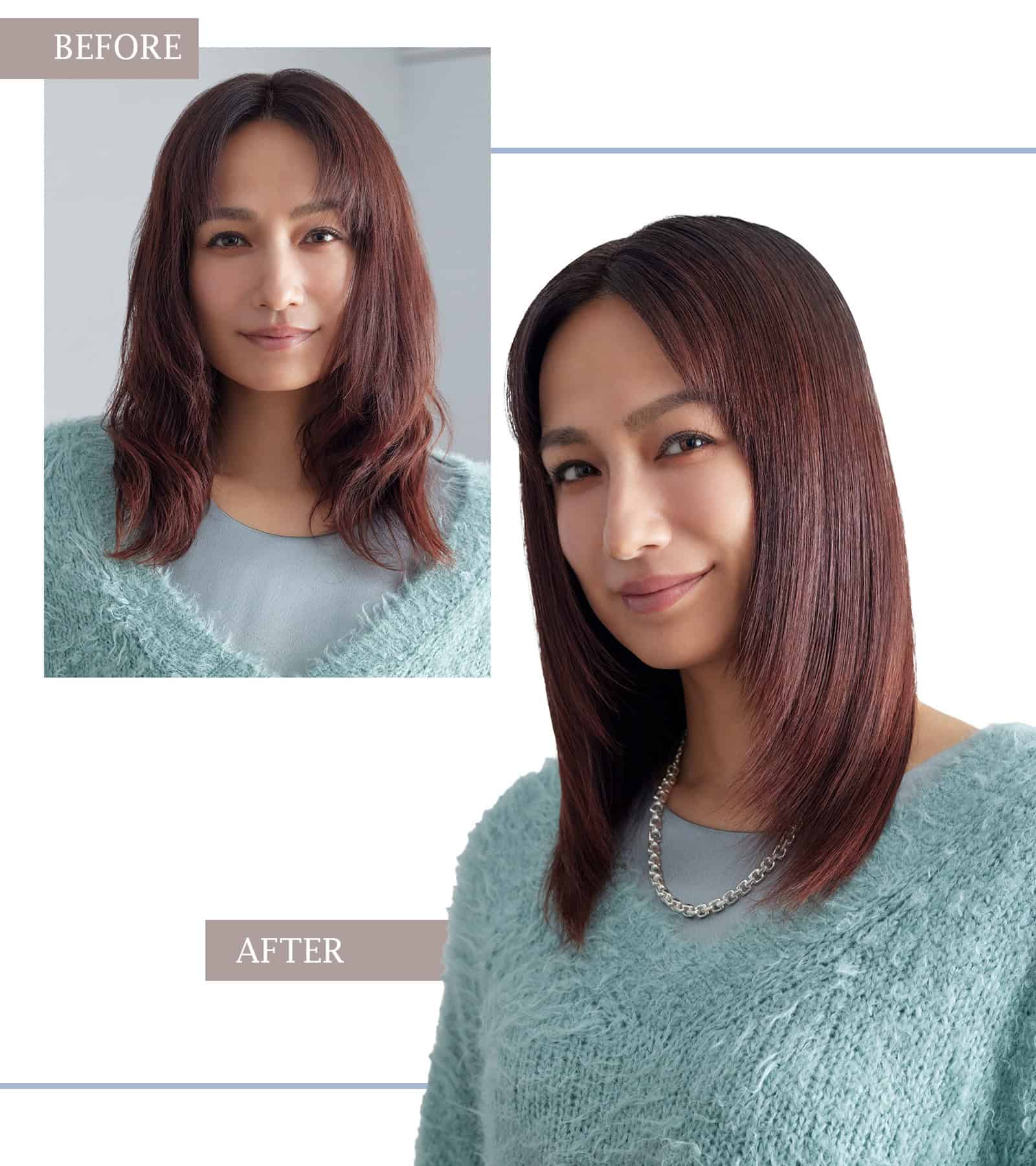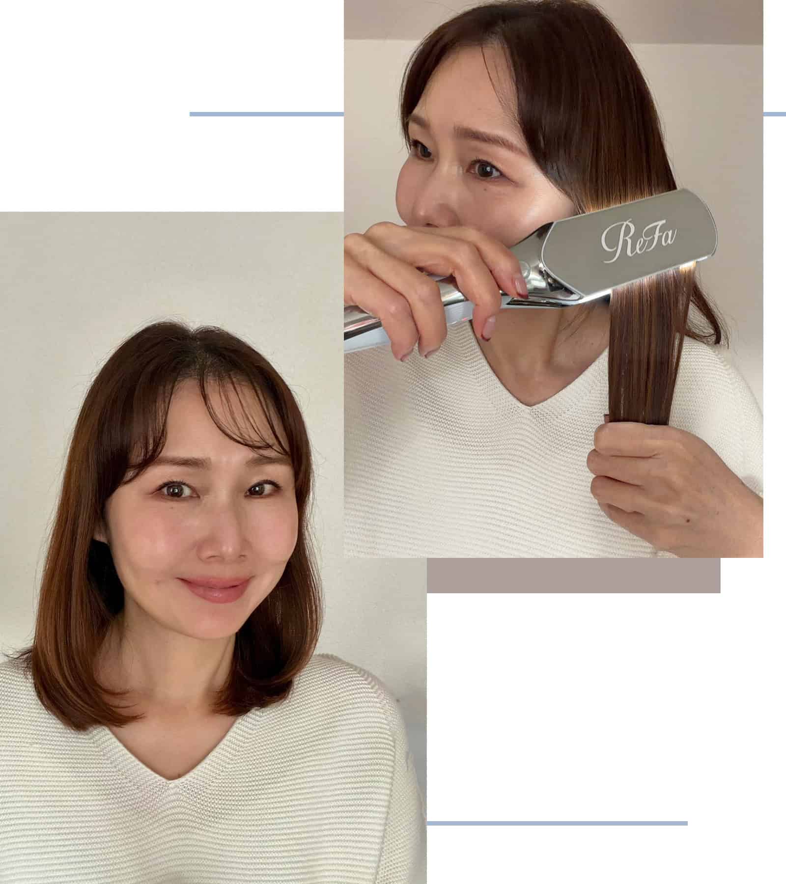 年を重ねるごとにどんどんうねりが強くなってきてしまい、特に湿気を含むと広がって見えるので毎年、梅雨の時期の前にゆるく縮毛矯正をかけるようにしています。半年くらい経ってくるとだんだん内側が気になってきたり、前髪はこまめにカットするので、追いつかない状況。軟毛で髪が弱いのであまり高温のヘアアイロンを使うとカラーが抜けたり髪がバリッと硬くなってしまいますが、〝リファパワーストレートアイロン プロ〟はダメージを感じさせず、髪の毛の手触りがなめらかに感じましたし、同時にツヤも感じられます。