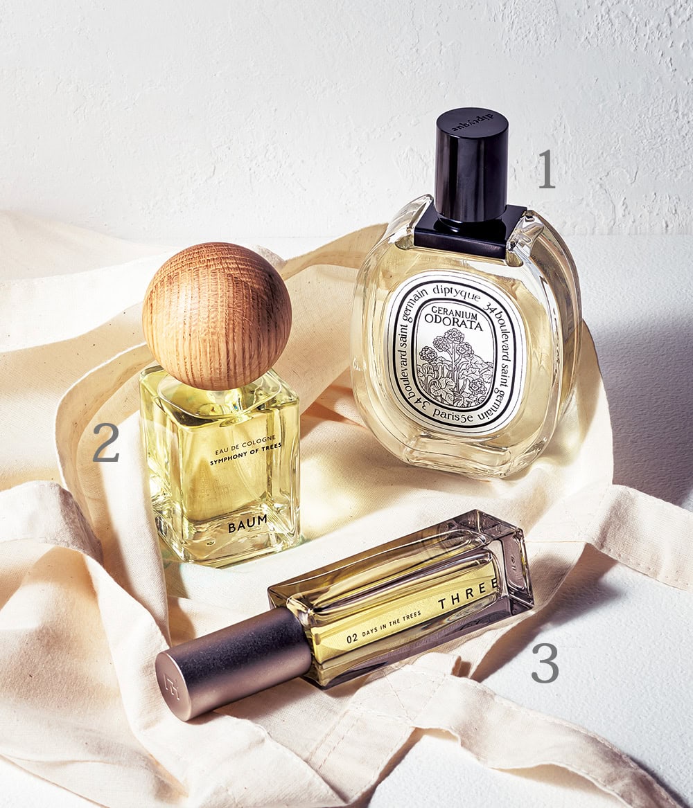 森を抜ける風のよう。ゼラニウム等のハーブで深呼吸したくなる香り。THREE エッセンシャルセンツ R 02 DAYS IN THE TREES 30ml ¥13,200/THREE