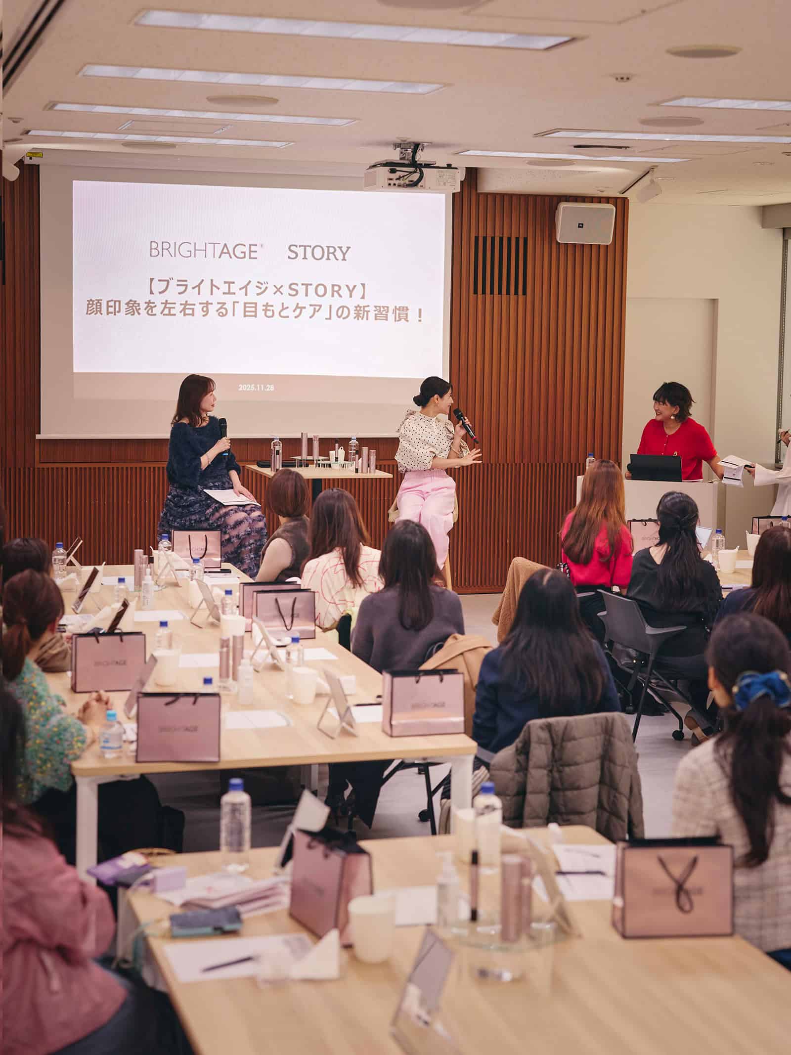40代の目もとには、シワ・たるみ・乾燥くすみ……と複数の悩みが重なり、「何から始めれば?」と迷う声が多く聞かれます。そんなSTORY世代のリアルなお悩みに応えるべく開催された「STORY×ブライトエイジ 目もとケアの新習慣」イベントには、美容職歴23年、マミ様の愛称で親しまれる美容家・瀬戸麻実さんが登場! さらに、「奇跡の50代」と呼ばれ、その透明感あふれる美しさで読者だけでなくスタッフから厚い信頼を得ているSTORY美容ライター尾﨑亜佐子(以下、尾﨑)とのトークショーも実施されました。