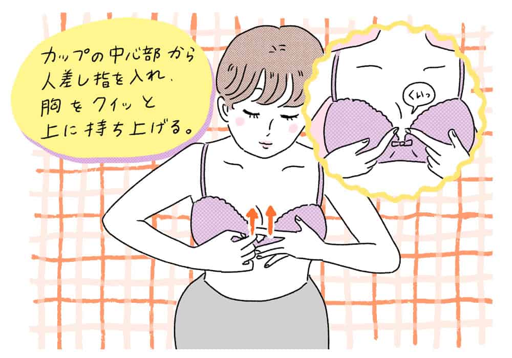 意外と見落とされがちなのが、カップの中心に指を入れて、バストの下部分をクイッと持ち上げるひと手間。こうすることで、バストの下がワイヤーに押しつぶされるのを防ぎ、自然で美しい位置に収めることができます。ぜひ試してみてください。