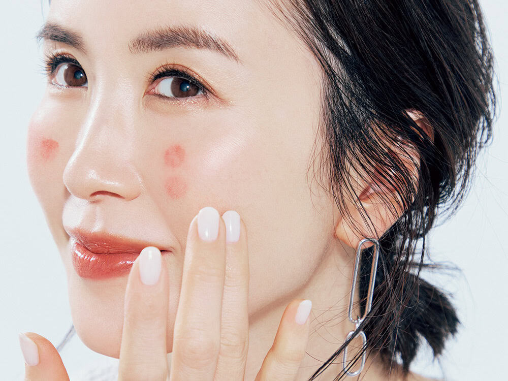 敏感肌には、カサつきが気になる頰に潤いをのせて、肌ツヤや血色感も足せる一挙両得なバームチークがオススメ。ポンポンと優しく肌において馴染ませて。