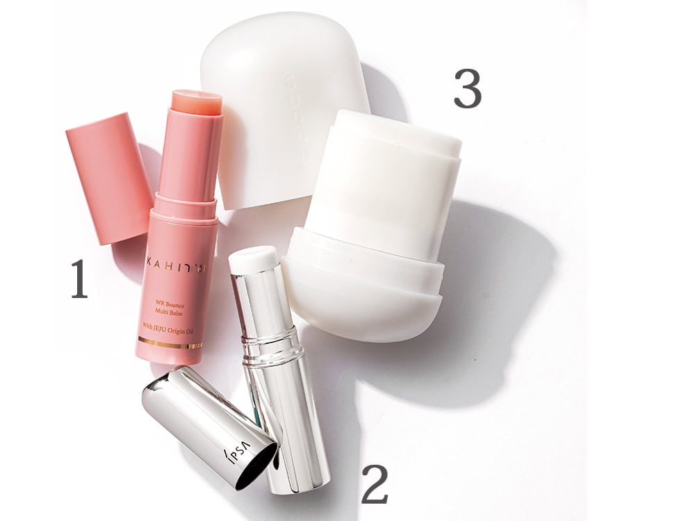 1. WRバウンス マルチバーム ¥3,190/KAHI、2. ザ・タイムR デイエッセンススティックe ¥3,410/イプサ、3. グロウイング バーム ¥5,940/SUQQU