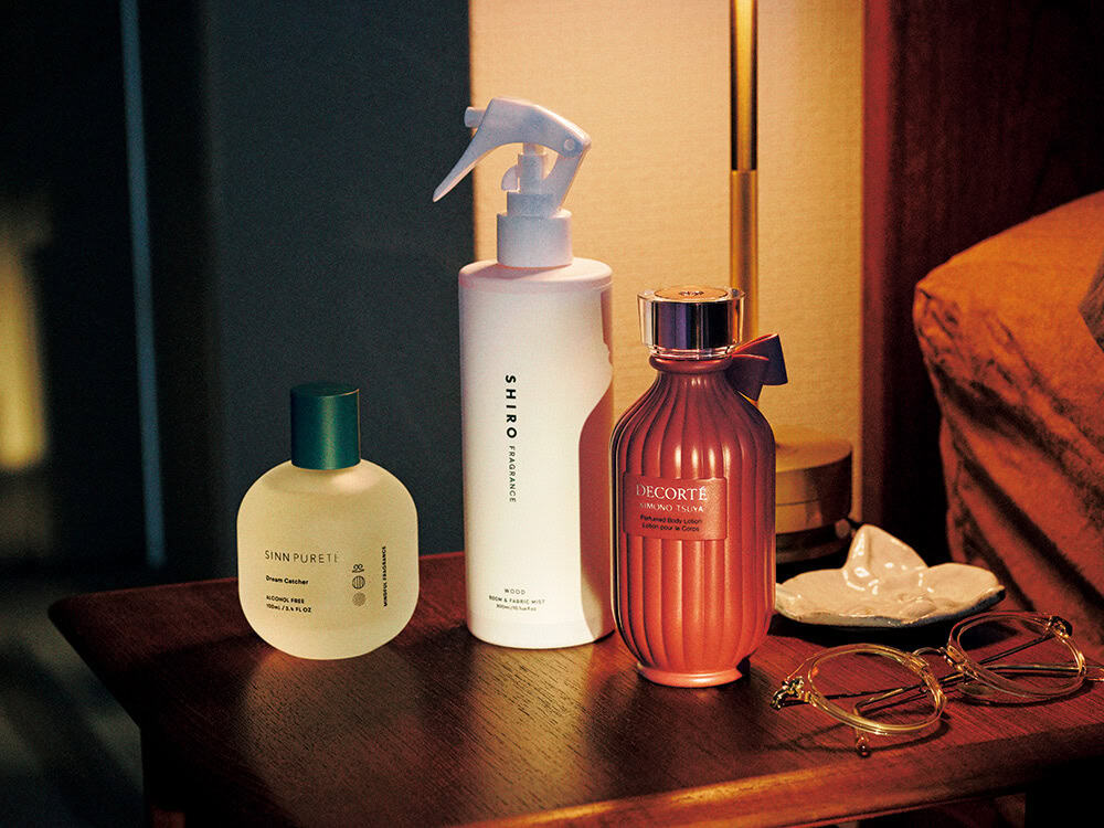 穏やかに心静める「ムスク」や、大自然を想起させるベチバー、サンダルウッドなどの「ウッディ」。ふんわり香る、ボディローション、ピローミストで選んでみて。
