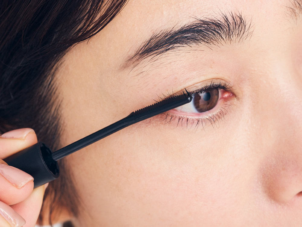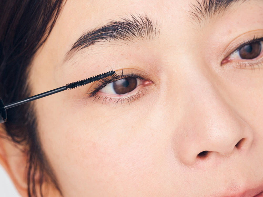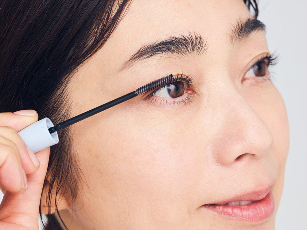 まつ毛は毛流れで印象が激変します。弱々しいまつ毛は、ビューラーでしっかり上げてから、3本のマスカラ使いでカールを一日中キープ。