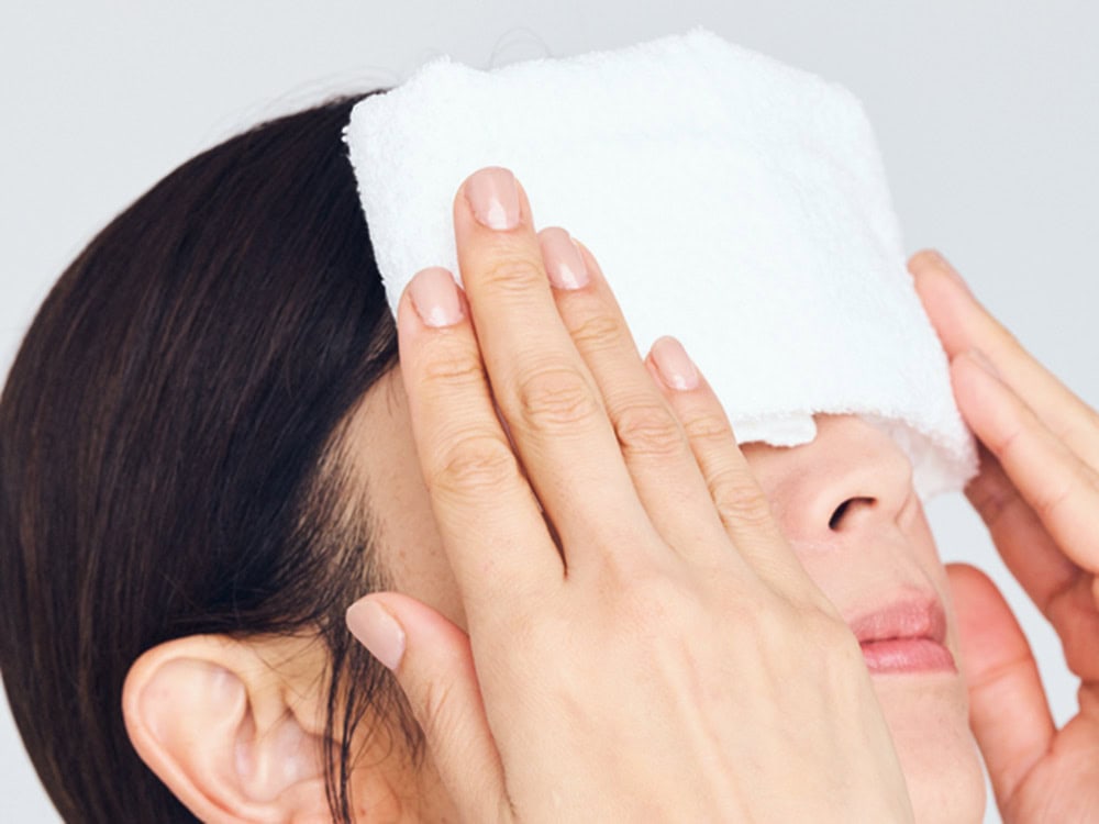 ① 温かいタオルで目元を30秒〜1分ほど温め 、冷たいタオルで30秒〜1分を3〜4回くり返す。