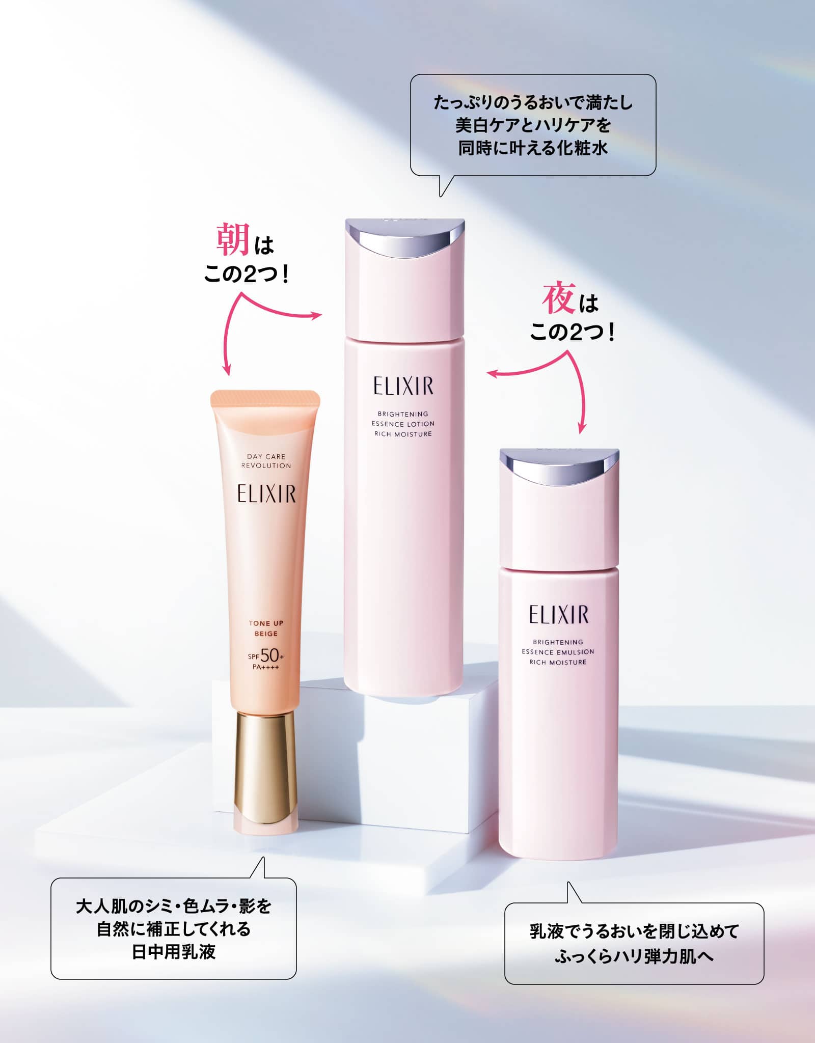 この春進化したエリクシールのブライトニングローション&エマルジョン。W美白有効成分(4MSK※2+m-トラネキサム酸※3)に加えて、新たにゆるぎないハリのための独自成分コラジェネシス®※4を配合し、うるおって透明感とハリのある肌へ導きます。日中はデーケアレボリューションが乳液・化粧下地※5・UVカットの役割を1本で担い、夜は美白※6とハリ保湿のエイジングケアを。朝夜それぞれ2 STEPで、隙のない大人の美容習慣へ。