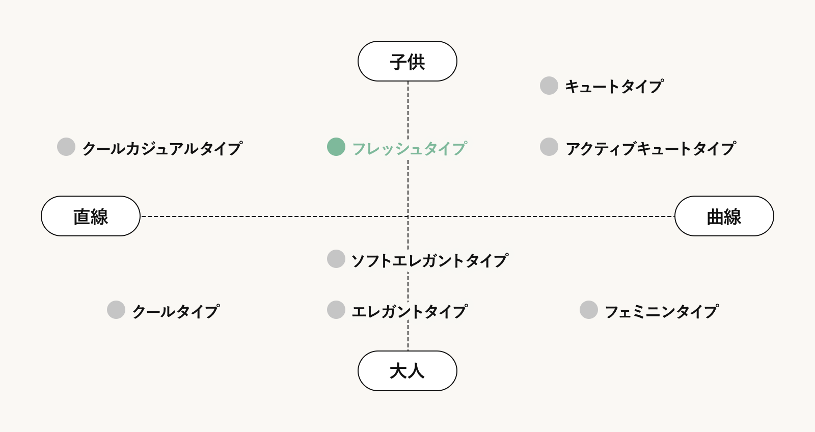 女性らしく清潔感のある「女子アナタイプ」。フレンドリーな雰囲気が醸し出されて話しかけられやすい柔らかな雰囲気が魅力です。年齢より若く見られやすい人が多く、歳を重ねても老けた印象になりません。ただ、好感度は高い割におとなしく見られたり、頼りなく見えたりというウィークポイントも。直線と曲線を併せ持っているので、比較的ファッションを選ばないタイプですが、最もよく似合うのは、シンプルな中に程よくカジュアルなエッセンスを利かせた、気取らないコーデです。