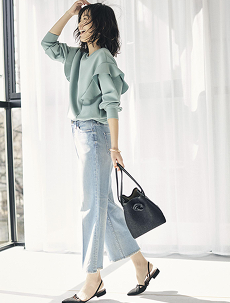 プルオーバー¥11,880(シップス/シップス 渋谷スクランブルスクエア ウィメンズ店)デニムパンツ¥14,300(ヘルシーデニム/ゲストリスト)バッグ¥39,600(ヴァシック/ビューティ&ユース ユナイテッドアローズ 丸の内店)シューズ¥47,300(ロートルショーズ/ティースクエアプレスルーム)ピアス¥8,800バングル¥9,350(ともにワンエーアールバイウノアエレ/ウノアエレ ジャパン)