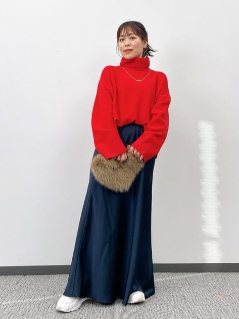 鮮やかな赤のタートルニットとサテンスカートを合わせて上品なツヤ感をプラスした冬らしい洗練コーデ。高級感のあるサテンスカートは、美しい落ち感で着痩せ効果も抜群。全体をクリーンな印象に仕上げつつ、小物でさりげないアクセントを加えたスタイルが女性らしいエレガンスを演出します。