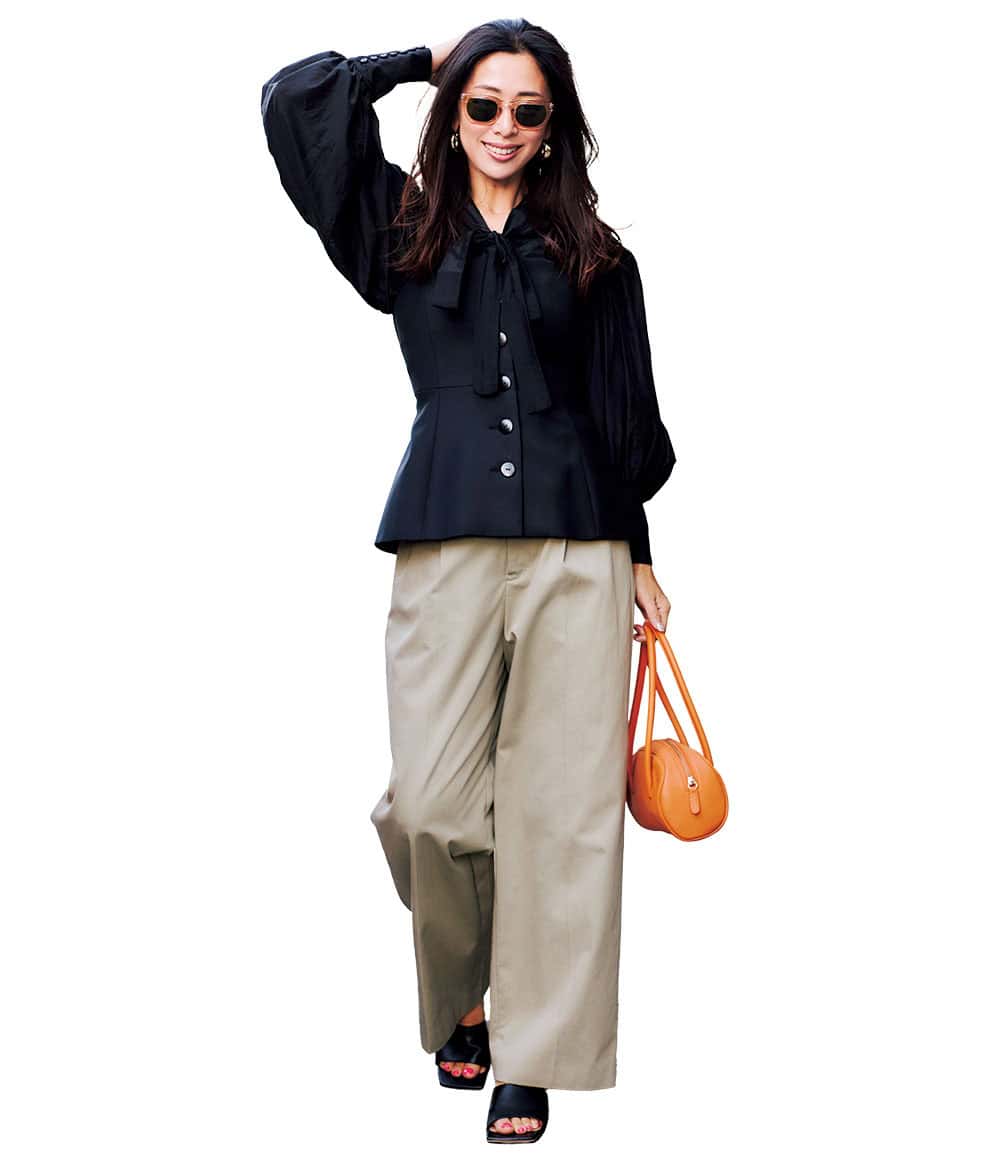 ビスチェ(着回し)¥39,600(THIRD MAGAZINE)ボウタイブラウス¥88,000(マリハ)チノパンツ¥23,100(マイストラーダ/マイストラーダ プレスルーム)バッグ¥35,200〈モフィオラ〉ミュール¥71,500〈ペリーコ〉(ともにアマン)サングラス¥52,800(モスコット/モスコット トウキョウ)ピアス¥9,240(ピルグリム/ZUTTOHOLIC)