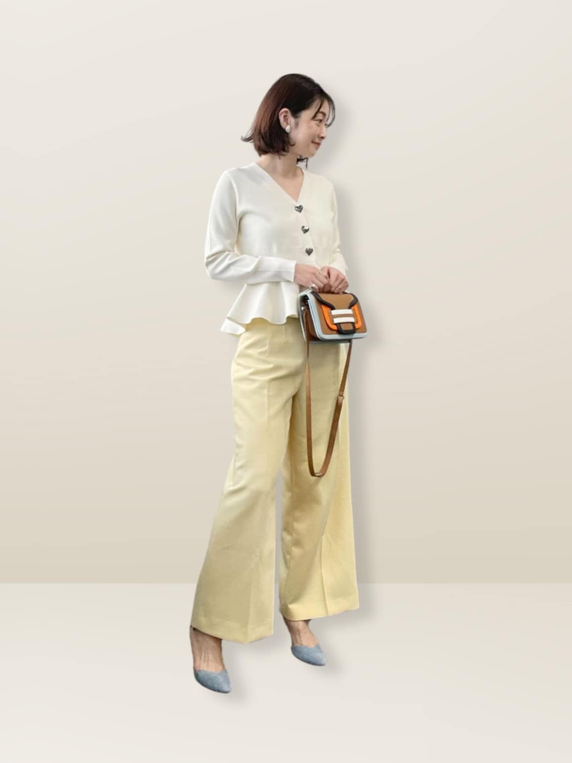ハートボタンが愛らしさを添える白のペプラムカーデはまさに“着るだけでキレイ”が叶う万能アイテム。裾の広がりがウエストを華奢に見せ、パンツ合わせでと女性らしさをしっかりキープします。ほんのり黄みがかったカラーパンツを投入で優しげな春らしさを演出。コンパクトなシルエットとサマーニットのような着心地で、着回し力も抜群です。