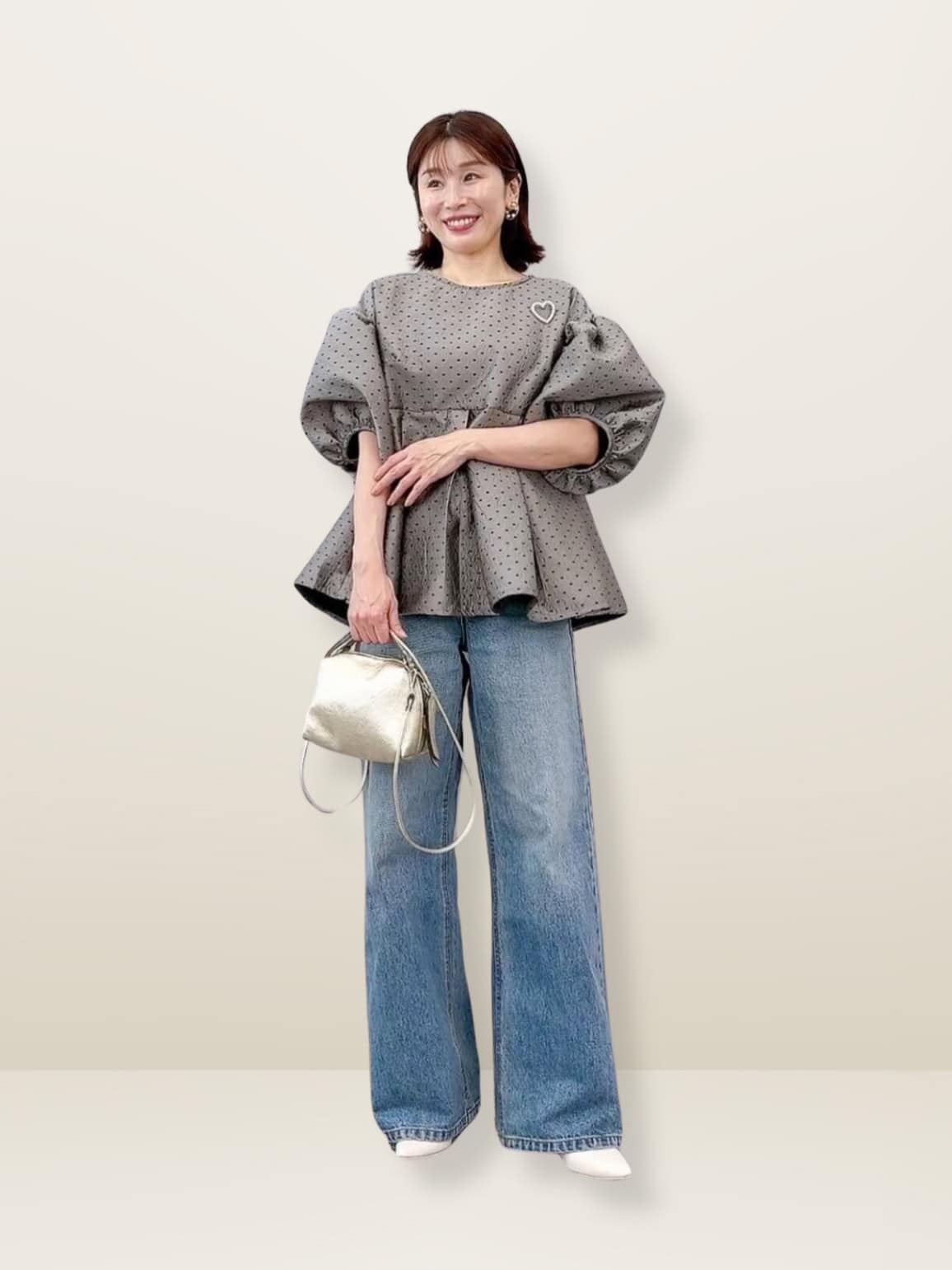 たっぷりとした袖とフレアな裾が目を惹く、主役級のペプラムブラウス。グレーベースのシルバーに小さめドットがほどよい甘さをプラスします。高めの切り替え位置と立体シルエットで、デニムを合わせてもきちんと感はしっかりキープ。ドレッシーにもカジュアルにも振れるアイテムなのでアクセサリーや小物次第で幅広く楽しめます。