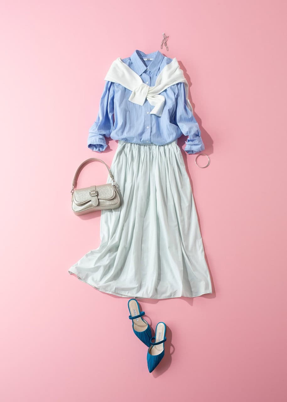 コットンシャツ¥2,990 UVカットクルーネックカーディガン¥2,990ボリュームギャザースカート¥3,990(すべてユニクロ)バッグ¥18,700(ダイアナ)シューズ¥64,900(ネブローニ)ピアス¥38,500バングル¥25,300(ともにウノアエレシルバーコレクション/ウノアエレジャパン)