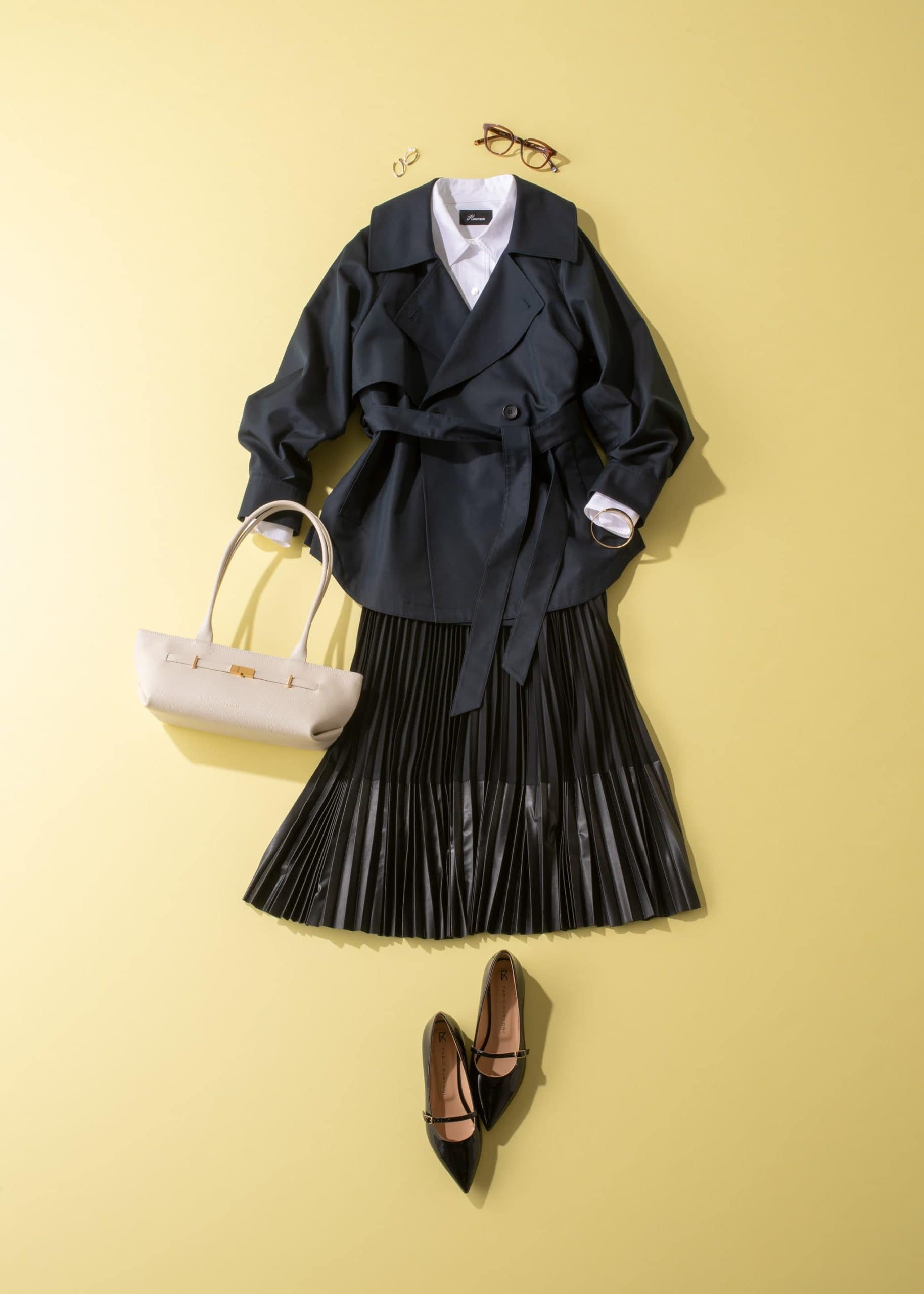 お仕事コーデといえば、白シャツ&紺トレンチならハズレなし。動きのあるプリーツスカートを合わせて軽やかに。トレンチコートはショート丈が今のトレンド。PLSTで見つけたこちらは、素材の高級感とは裏腹に、洗濯機で洗える点もイチオシです。