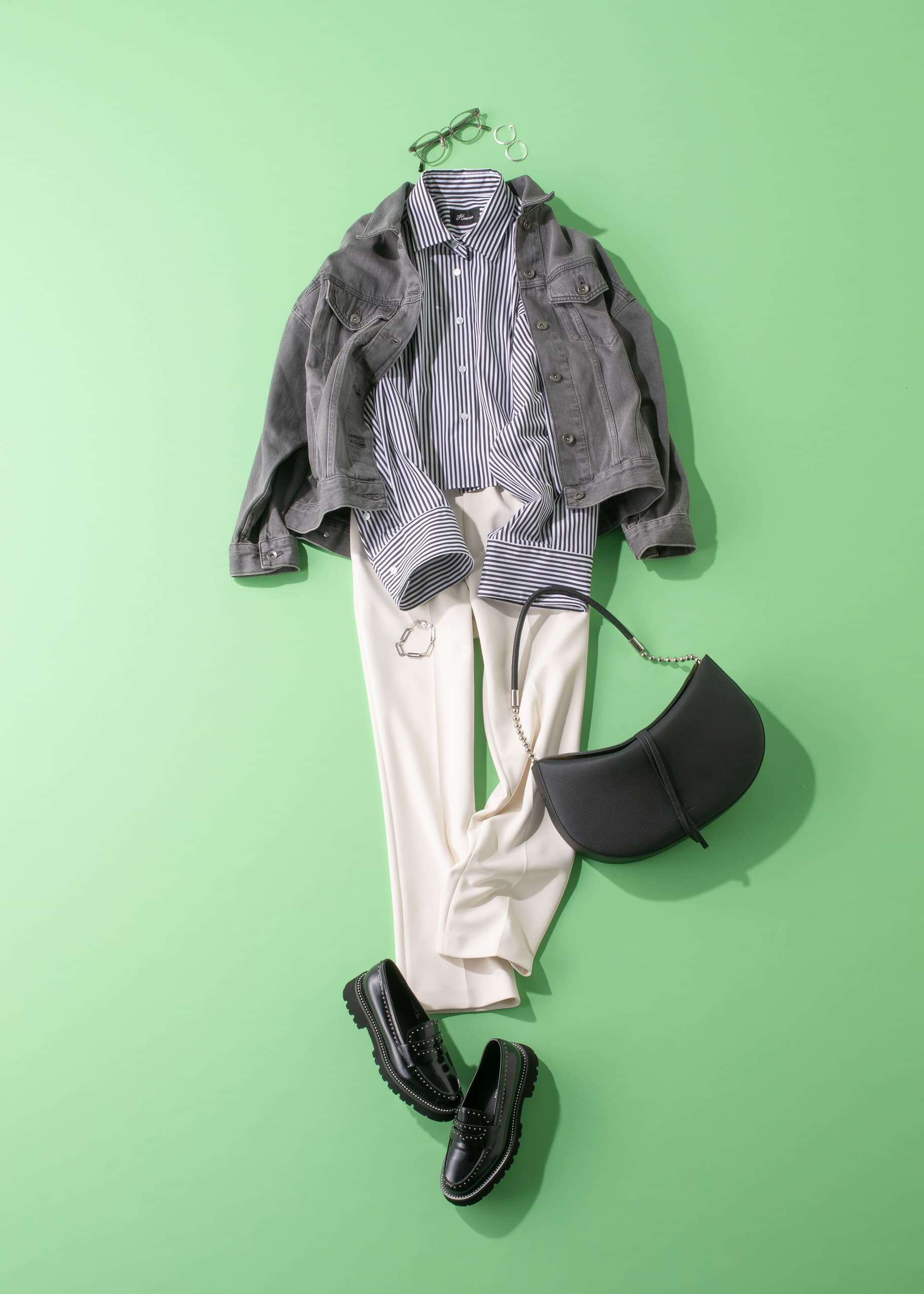 デニムジャケットもブラックを選べば、カジュアルさを抑えられてオフィスにもマッチ。太めストライプのシャツで遊び心を取り入れつつ、シルエットのきれいな白パンツを合わせてフォーマルにまとめます。靴とバッグはブラックをチョイスし、レザーの質感でコーデ全体を引き締めて。