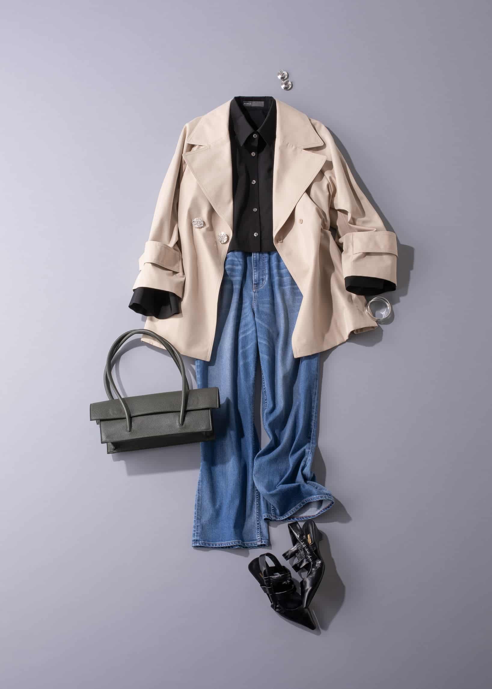 シャツ×デニムのシンプルコーデには、ショート丈とワイドな衿がポイントの旬のトレンチコートを羽織って。大きめビジューボタンが春らしい華やかさを演出してくれ、手軽に上質なお仕事コーデが完成。ショート丈のアウターは足さばきがよく、通勤の際や雨の日にもピッタリです。