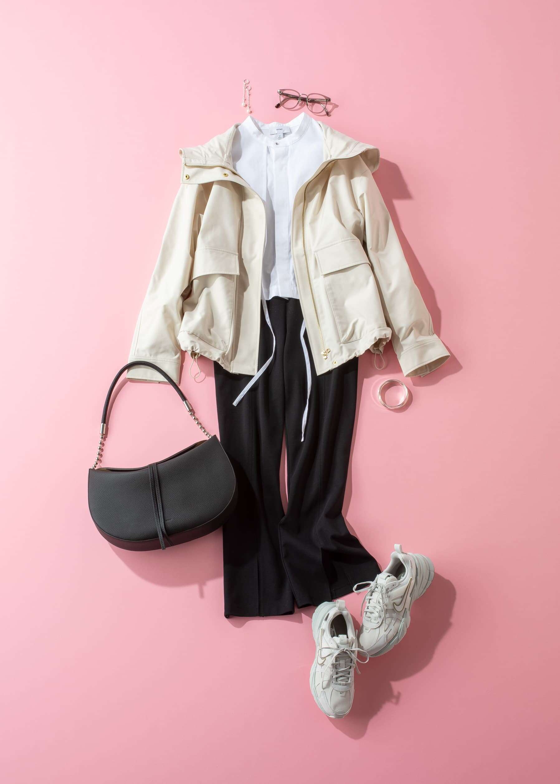 最近はお仕事コーデにもスニーカーを取り入れる人が多い様子。白ブラウスと黒パンツのフォーマルコーデは、抜け感を出すことで今っぽく。GUのカジュアルなマウンテンパーカーは色味やシルエットがスポーティ過ぎないので、まじめなコーデにもしっくり馴染みます。撥水加工によって梅雨時期にも活躍でき、幅広いボトムスに合わせられる着回し力の高さも魅力。