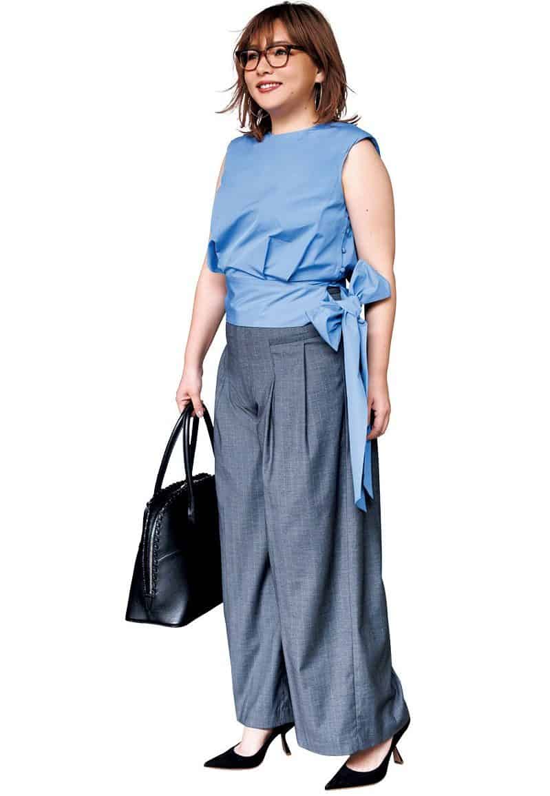 パンツ¥22,000(メゾンスペシャル/メゾンスペシャル 青山店)ブラウス¥46,200(エステータ/オンワード樫山 お客様相談室)バッグ¥143,000(メゾンヴァジック/ヴァジックジャパン)パンプス¥75,900(ペリーコ/アマン)メガネ¥28,600(ブラン/ライト)ピアス¥9,900(トゥデイフル/LIFE’s 代官山店)