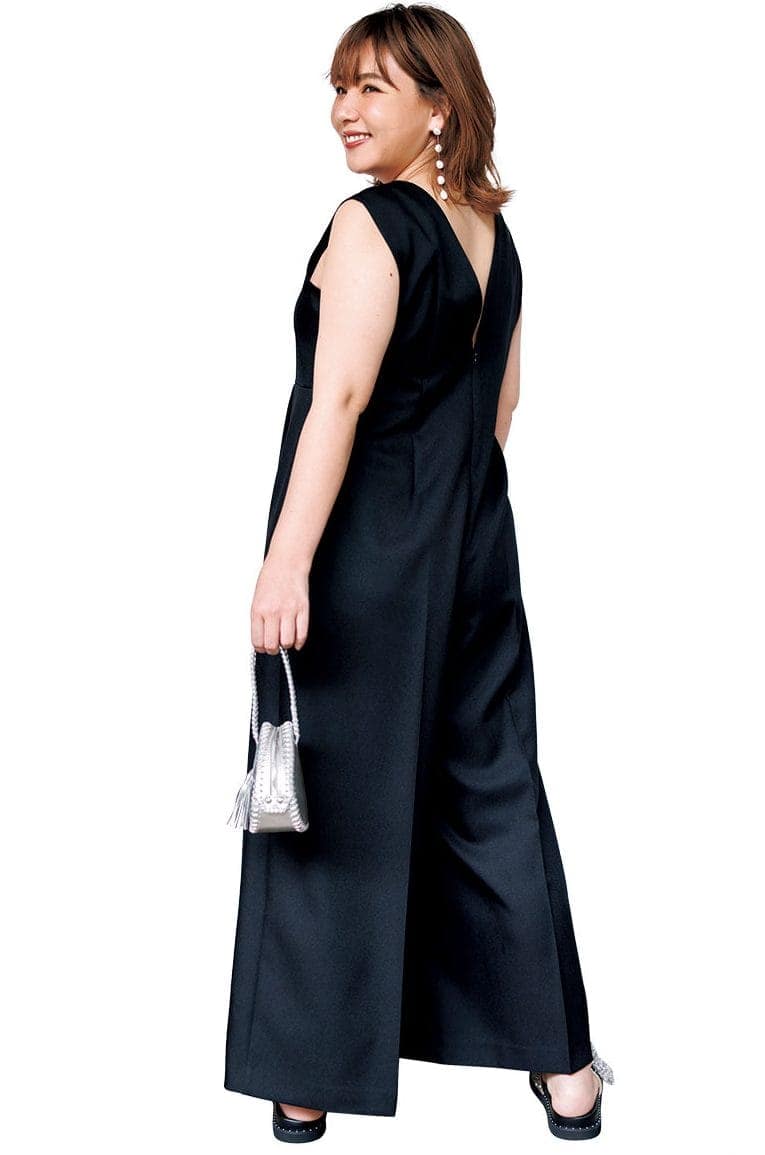 メンズライクなオールインワンも、背中が大きく開いていることで大人の色気を感じるデザインに。センタープレス&ハイウエストで、スタイルアップ効果も抜群。