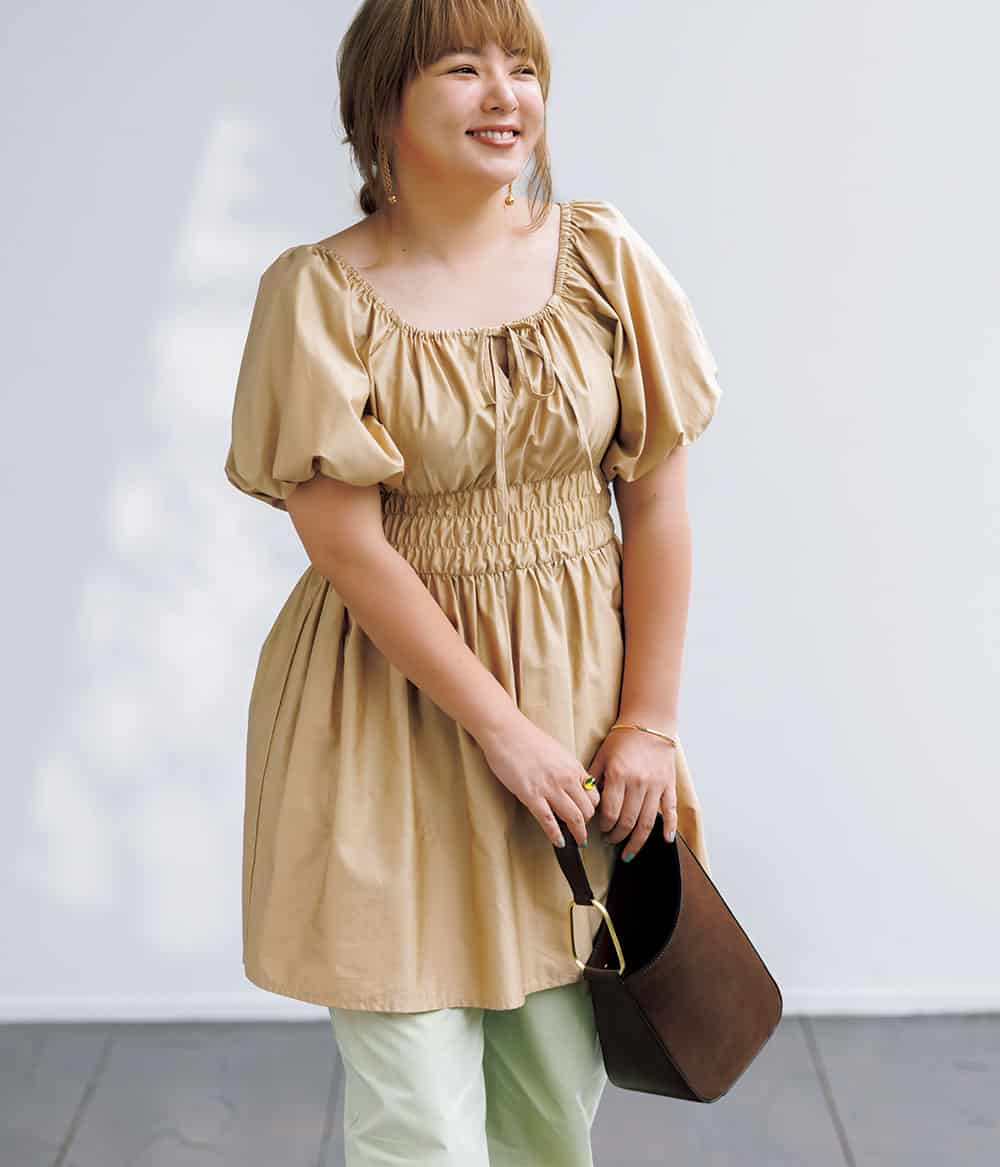 トップスは大人可愛いパフスリーブに、マシュマロさんの魅力の一つであるデコルテを見せて艶感をプラス。ウエストの太リブギャザーがスクエアをより際立たせます。ミントグリーンパンツでフレッシュ感も。