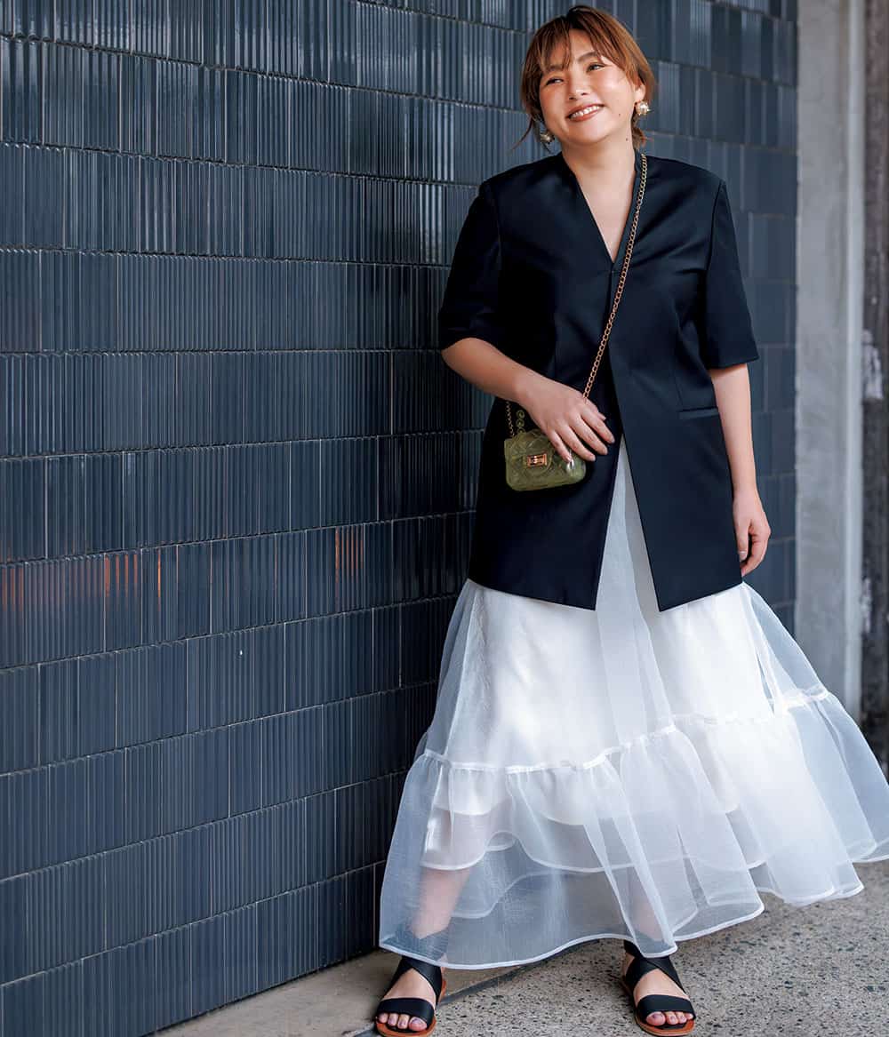 ふんわり揺れる軽やかさが魅力のチュールスカート。華やかなルックスですが、実はコーディネートは簡単!重要なのは、カジュアル・フォーマル問わずシンプルな形のトップスを合わせること。Tシャツ&サンダルと組み合わせるだけで、鮮度の高いお出かけコーデが完成。