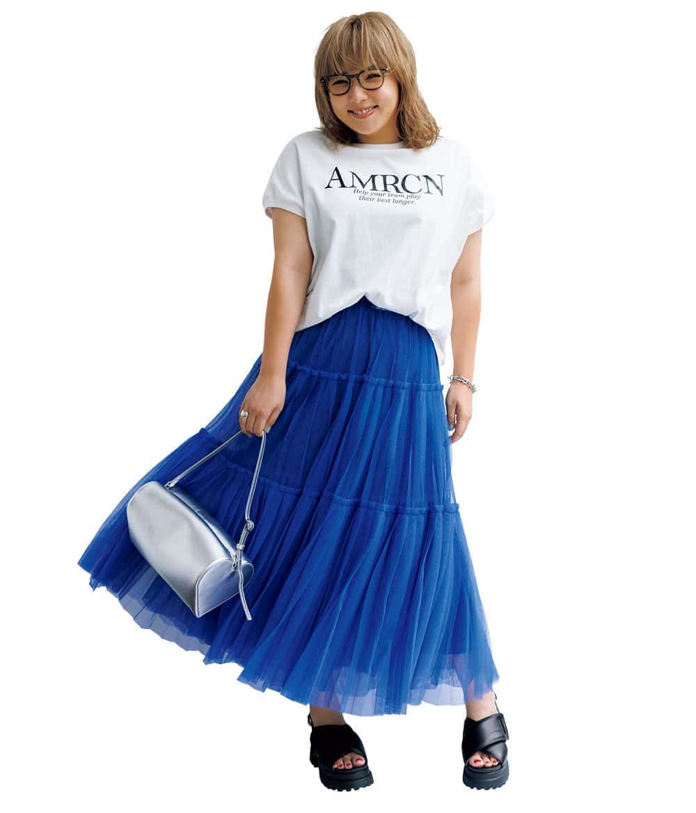 Tシャツ¥8,800(アメリカーナ×ジーンズ ファクトリー/ジーンズ ファクトリー 卸団地本店)スカート¥47,300(STUMBLY/スピック&スパン ルミネ有楽町店)バッグ¥37,400(ヴァジック/ヴァジックジャパン)サンダル¥18,150(ダイアナ/ダイアナ 銀座本店)メガネ¥58,300(アイヴァン/アイヴァン 東京ギャラリー)ブレスレット¥6,600(エイチアッシュ/フォーティーン ショールーム)リング¥10,010(チビジュエルズ/チビジュエルズ・ジャパン)
