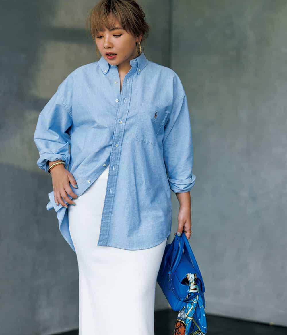 シャツ¥26,400(ポロ ラルフ ローレン/ビームス 原宿)ニットスカート¥35,200(カオス/カオス丸の内)バッグ¥372,900(トッズ/トッズ・ジャパン)スカーフ¥15,400(マニプリ)ピアス¥28,270(ベン・アムン/ZUTTOHOLIC)バングル¥25,300(ワンエーアールバイウノアエレ/ウノアエレ ジャパン)リング¥268,400(マリハ)