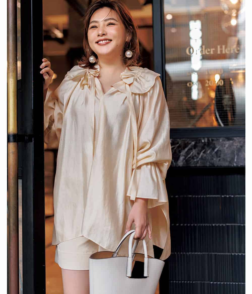 ブラウス¥26,400(デボーション ツインズ × デミルクス ビームス/ビームス ハウス 丸の内)パンツ¥19,800(カデュネ)バッグ¥42,900(オルセット/アッシュプラスエリオトロープ)ピアス¥8,800(ワンエーアールバイウノアエレ/ウノアエレ ジャパン)バングル¥1,050(アビステ)リング¥279,400(マリハ)
