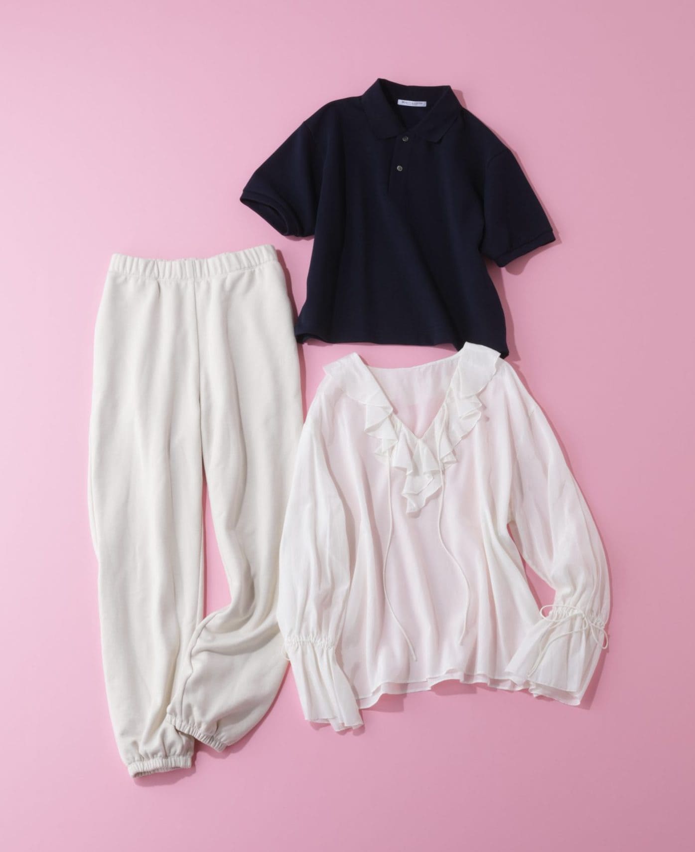 A旬のスポ可愛を作れるネイビーのポロシャツ。¥8,910、B好感アップを約束する白のブラウスはシーンレスに活躍。¥14,960(ともにビューティ&ユース) Cシャツを合わせてきれいめに穿きたいスウェットパンツ。¥11,000(ReNAVE)