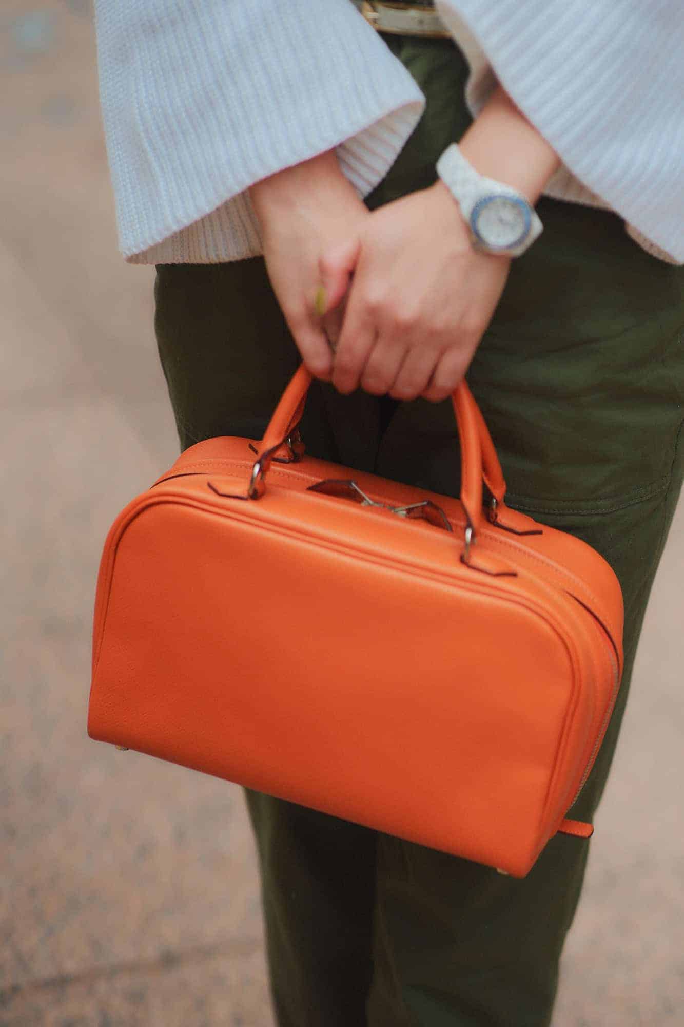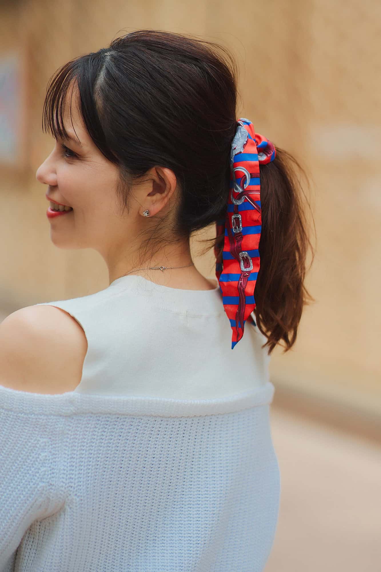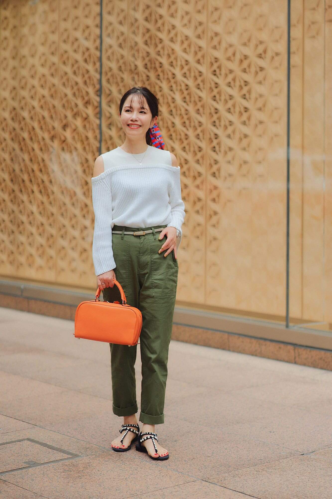定番色のカーキは肌なじみが良く、どんな色にも相性がよく、落ち着いた雰囲気に。爽やかな白を潔く合わせて初夏のシンプルな装いにまとめました。アクセントにオレンジを加え、ショルダーと足元を肌見せして抜け感を作っています。小さな頃からの洋服好きが高じて、パーソナルスタイリストの仕事をスタート。たくさんの方と一緒にコーディネートを作っていると、つくづく、ファッションは気持ちを前向きにしてくれる、女性にとってとても大切なものだと実感しています。