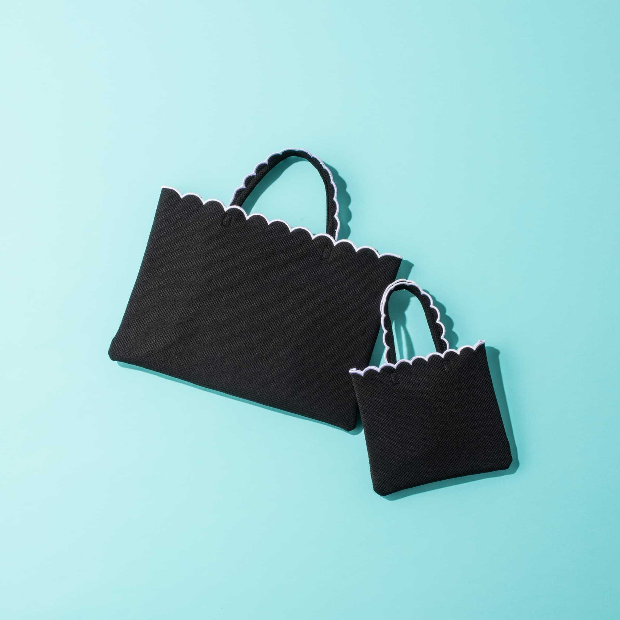 PCはもちろん、書類や雑誌も入るサイズでメインバッグと合わせて持っても馴染みやすい薄型のトートバッグ。メッシュ生地なので軽く、黒でも夏らしい印象に。スカラップ刺繡が華やかで大人可愛く持てます。付属のミニバックは同時に持つのはもちろん、単品使いでも。